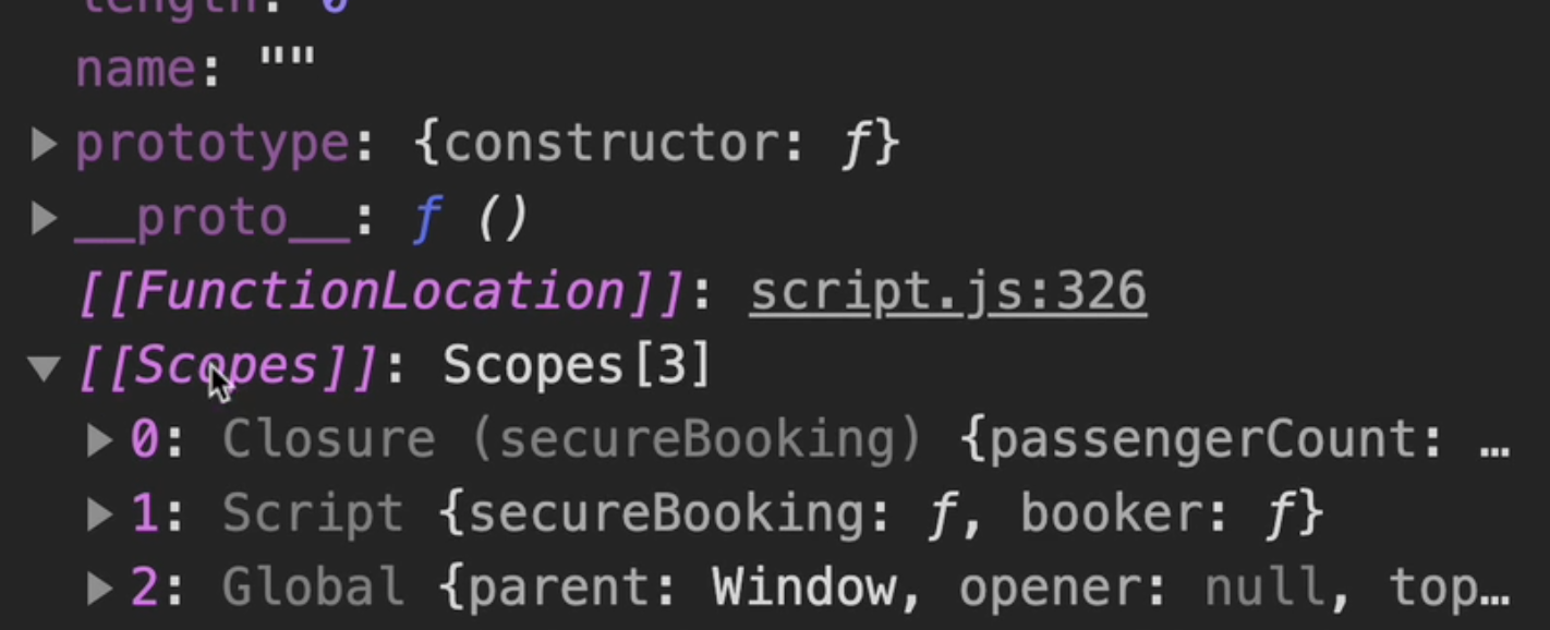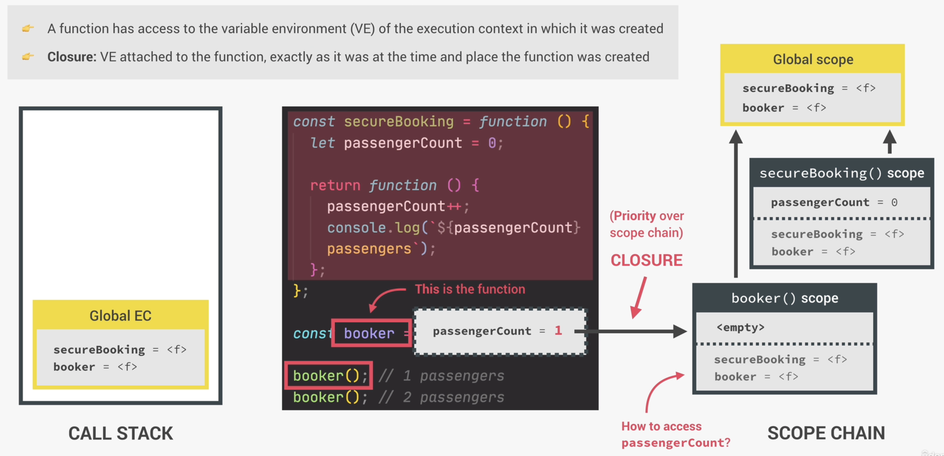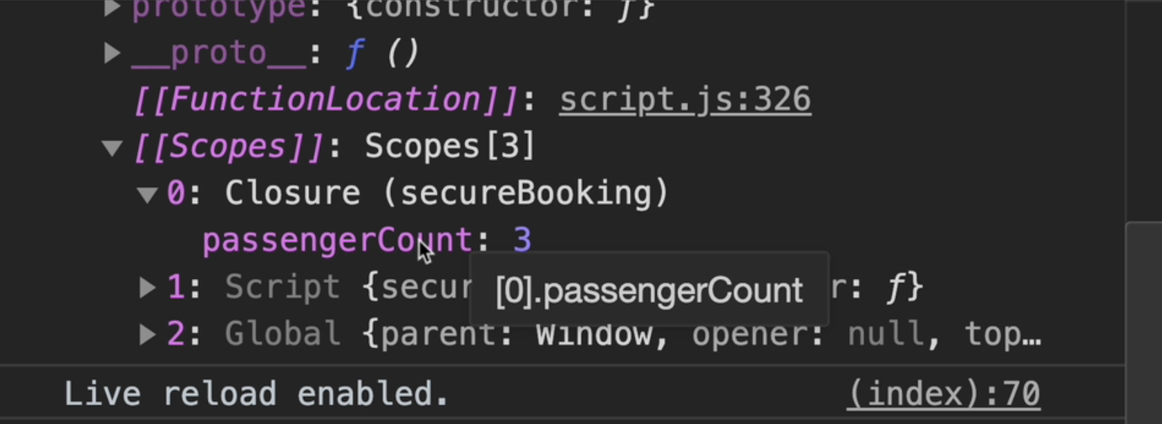 클로저란 기능은 배열이나 새기능을 만드는 것처럼 사용자가 명시적으로 사용하지 않는다. 특정 상황에서 자동으로 사용되며 클로저를 사용하고 있다고 이해하면 된다. 클로저를 이해하기 위해 아래 코드를 통해 예시를 살펴보자. secureBooking이라는 함수를 정의하였다. 이 함수는 passengerCount라는 변수를 가지며 이는 외부에서 조작하거나 접근할 수 없다. secureBooking 함수는 함수를 return하는데 상위에서 정의한 passengerCount 변수를 업데이트하는 것이다.