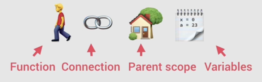 - A closure makes sure t hat a function doesn't loose connection to variables that existed at the function's birth place. (클로저는 고향과 연을 끊지 않는 사람에 비유할 수 있다. 사람은 함수이고 고향은 Parent scope라고 생각해보자)