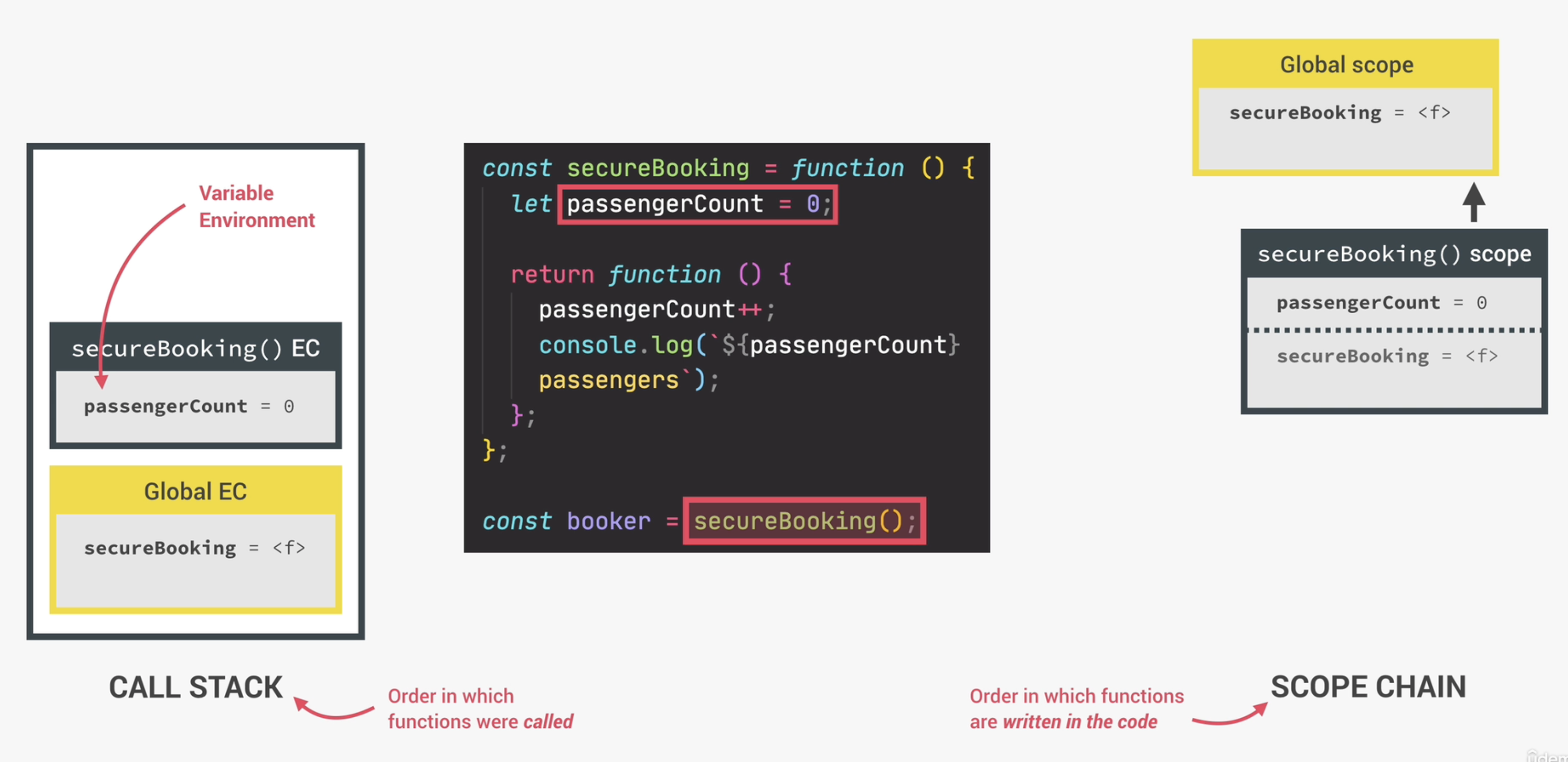 그 후 secureBooking 함수가 실제로 실행될 때 새 실행 컨텍스트(EC)가 Call Stack의 맨 위에 놓이게 된다. 각각의 실행 컨텍스트(EC)에는 지역 변수를 포함하는 변수 환경(Variable Environment)이 포함되어 있다. 변수 환경(Variable Environment)은 함수의 범위이다. 이 실행 컨텍스트(EC)의 스코프 체인(Scope Chain)은 다음과 같다. passengerCount는 로컬 스코프(Local Scope)에 위치해있고 이 스코프의 모든 변수는 부모(Parent) 스코프에서 접근 가능하다. 이 경우 Global scope가 부모이다.