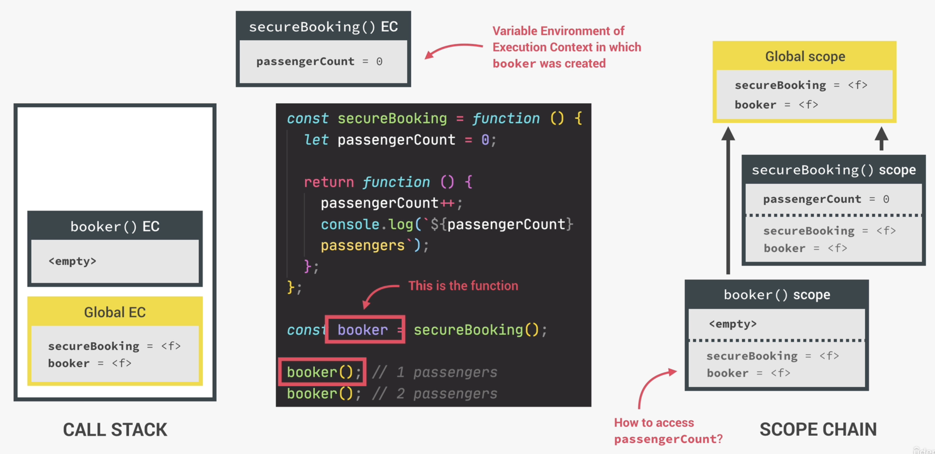 즉, 클로저는 이미 사라진 secureBooking의 실행 컨텍스트(EC)의 변수 환경 접속하여 조작한다. passgerCount는 secureBooking의 실행 컨텍스트에서 만들어진 변수이다. 클로저는 secureBooking의 변수 환경에 접속하여 passgerCount를 조작하는 것이다. 이러한 연결고리를 만드는 것을 클로저이다.