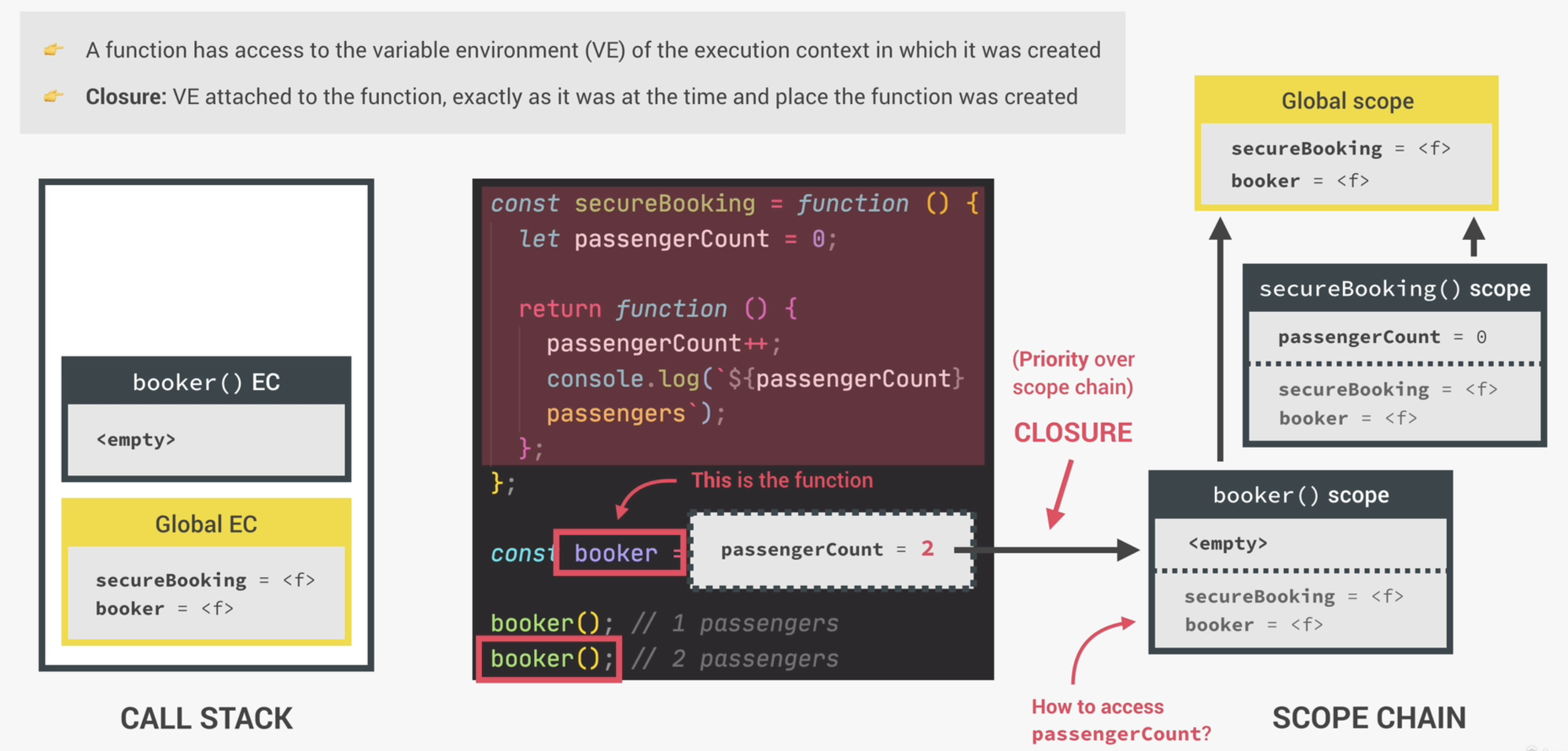 2. Closure: VE attached to the function, exactly as it was at the time and place the funcction was created (클로저는 함수에 연결된 변수 환경이다. 함수가 생성된 때와 장소와 정확히 일치한다)