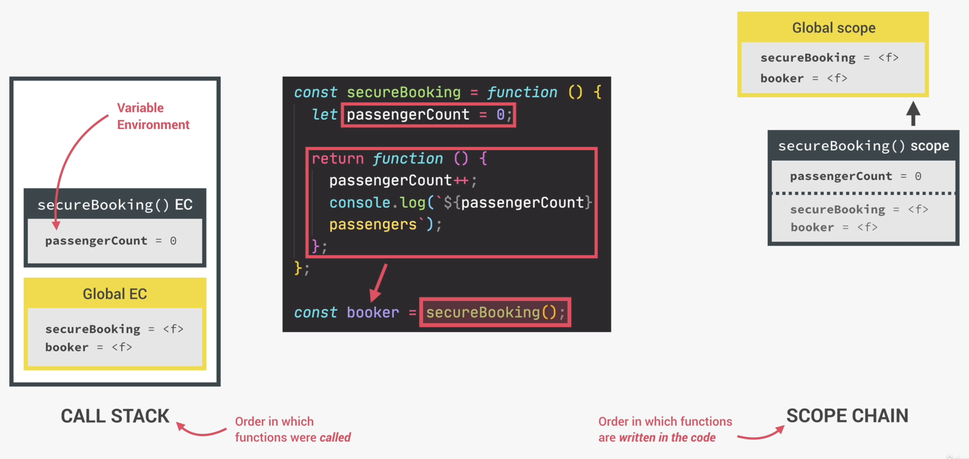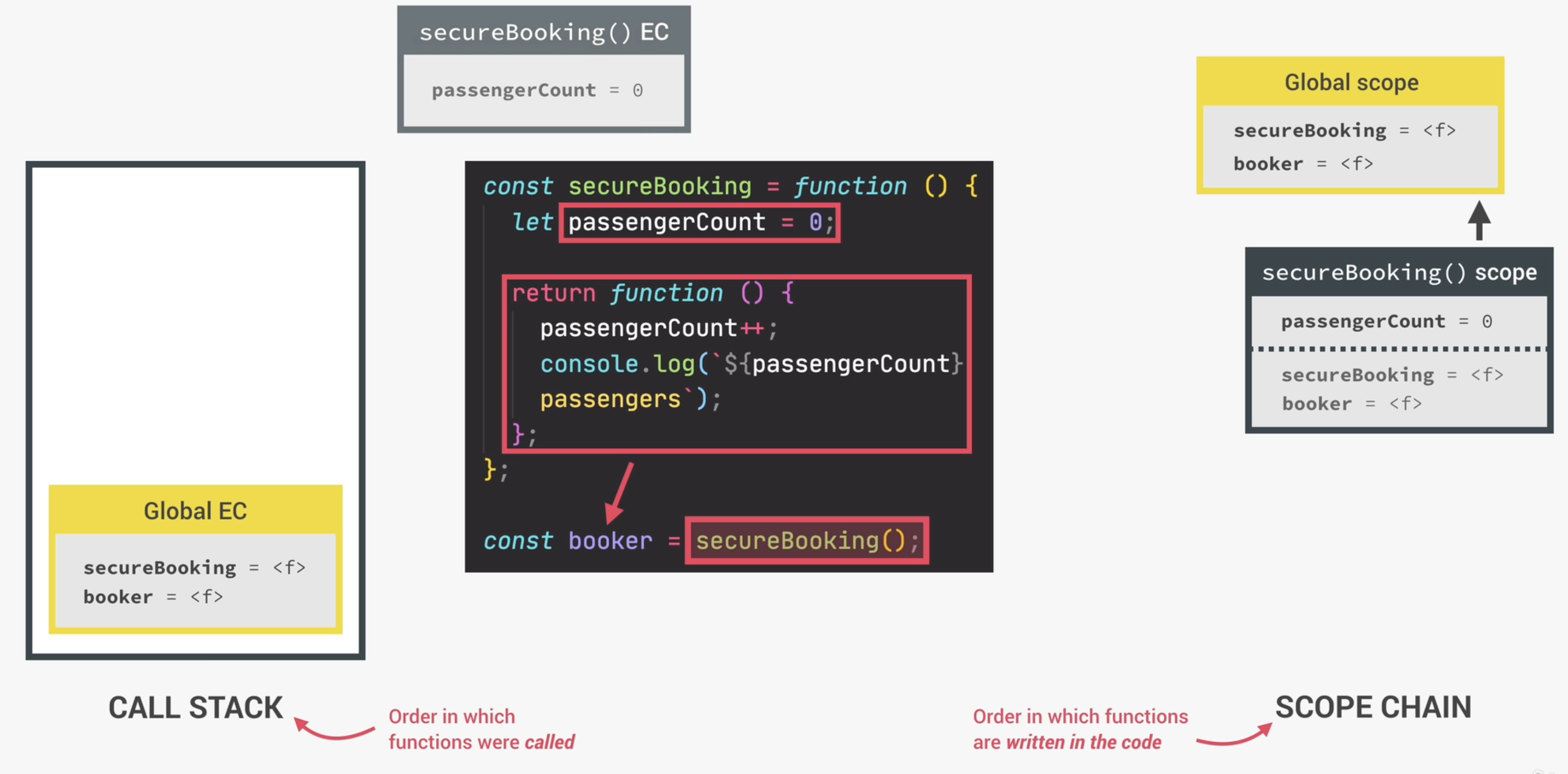 booker 함수를 실행하면 passengerCount를 증가시키려고 한다. 하지만, booker scope에는 변수가 존재하지 않는다. 이에 Javascript는 즉시 클로저를 바라 보고 거기에서 변수를 찾일 수 있는지 확인한다. 이 과정은 Scope Chain보다 먼저 발생된다. 즉, Scope Chain보다 클로저가 우선이다.