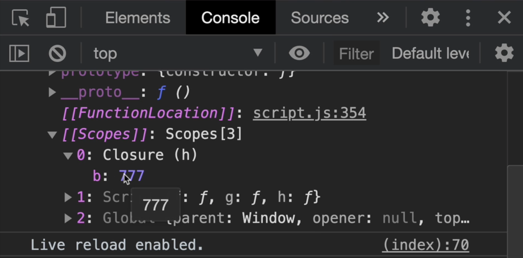 h 함수를 실행함에 따라 f가 다시 할당된다. 주의해야할 점은 첫번째 f() 실행의 함수와 두번째 f() 실행의 함수가 다르다는 것이다. h 함수를 실행하면서 f는 h의 변수환경을 Close over했다는 점을 알 수 있다. 그래서 777로 설정된 b 변수에 접근할 수 있는 것이다. 'console.dir(f)'를 입력하여 변수 환경을 실제로 확인해보자.
