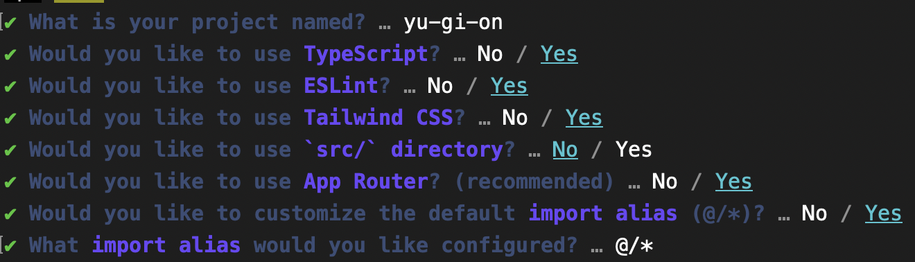 - App Router를 사용할 것인지 물어본다. (해당 옵션은 NextJS 응용 프로그램을 만드는 다른 두 가지 방법을 나타낸다. No를 선택하면 Pages Router를 Yes를 선택하면 App Router를 사용한다. App Router를 사용하는 것을 추천한다, Yes)