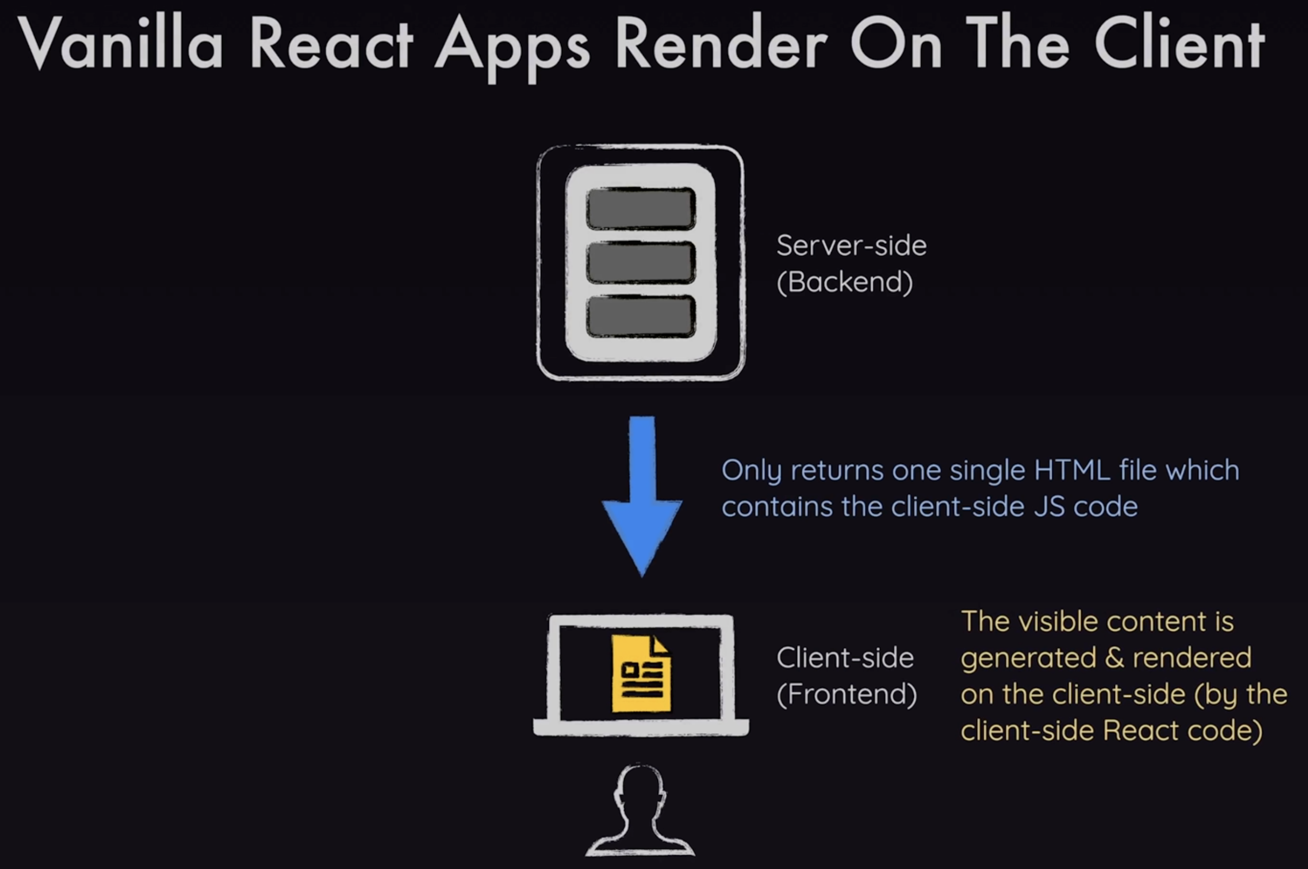 순수 React는 클라이언트 사이드 랜더링을 활용한다. 즉, React는 클라이언트 사이드 자바스크립트 라이브러리인 것이다. 이는 브라우저에서 실행되고, 조작되고, 수정되고 동작된다는 의미이다. 이는 UI 업데이트 시, 페이지가 새로고침이나 서버에서 다시 랜더링이 되는 일이 없이 클라이언트인 React 코드에서 가능하다는 의미이다. 다시 말해, 한 번 페이지가 로드되면 새 페이지를 서버에서 가져올 필요 없이 상태 업데이트가 가능하다는 말이다. 하지만, 여기에도 단점이 존재한다. 콘텐츠 소스가 없기 때문에 구글 같은 검색 엔진의 크롤러는 페이지 콘텐츠를 보지 못한다.