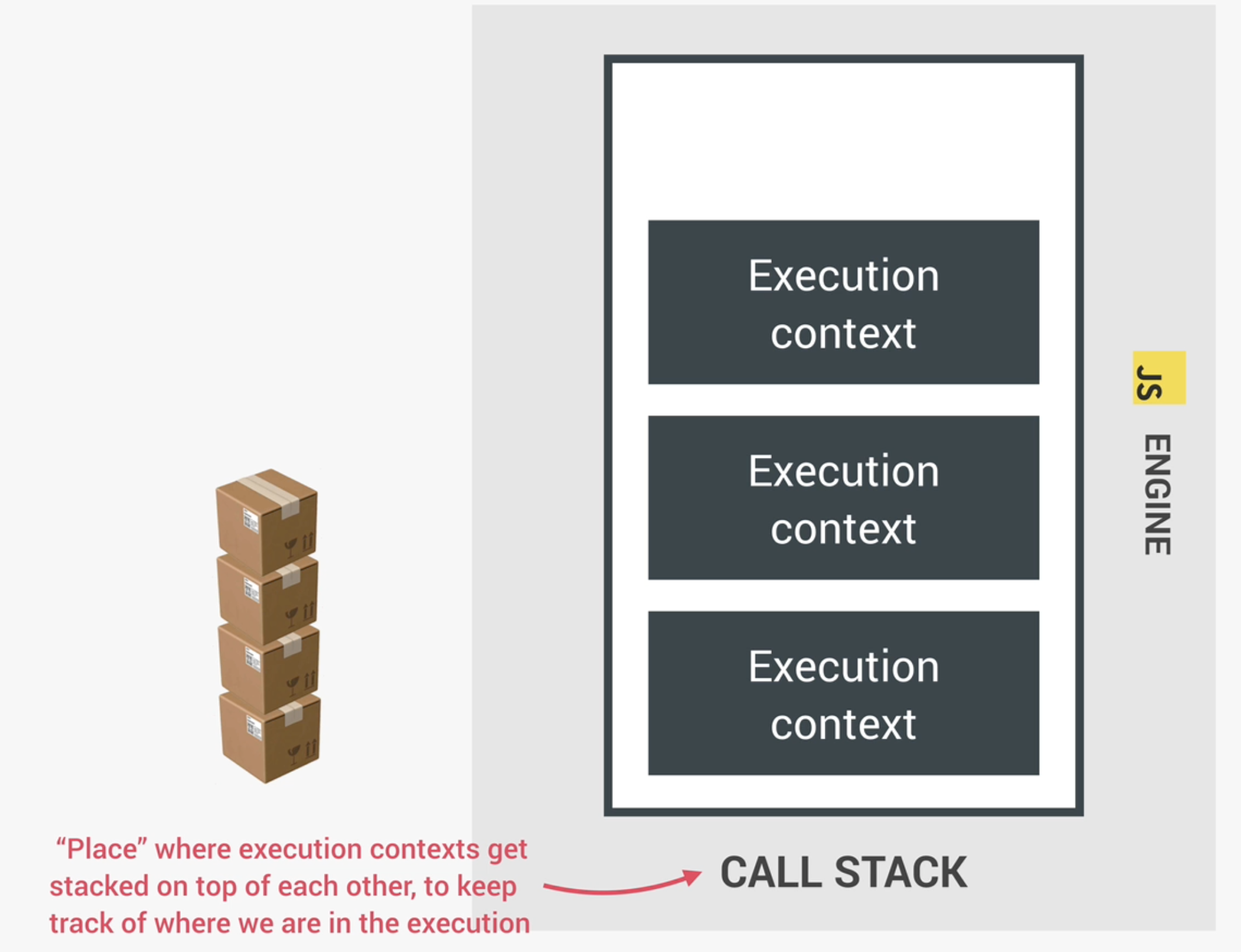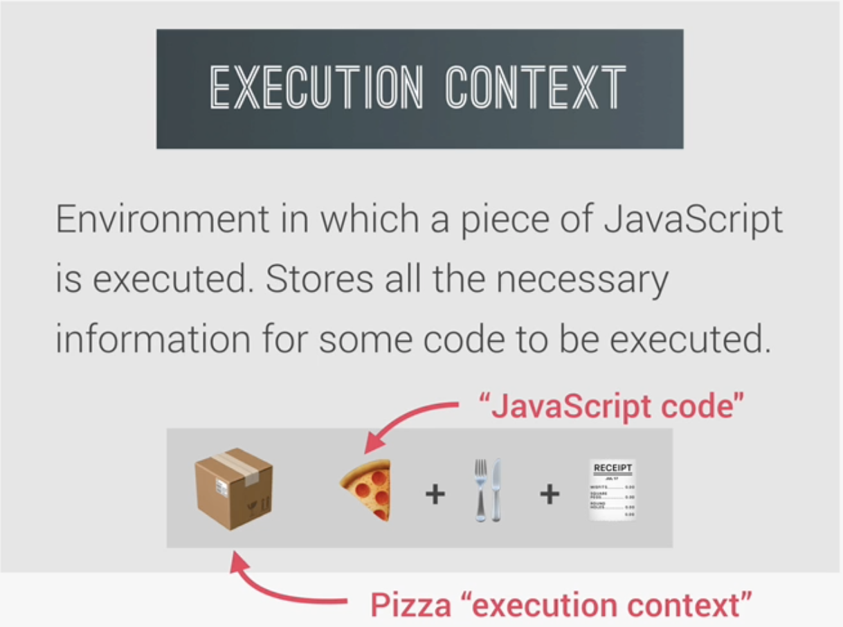 실행 컨텍스트란 자바스크립트를 실행시키기 위한 환경이다. 코드를 실행시키기 위한 모든 필요한 정보를 저장시키는 박스와 비슷하다. 이러한 정보에는 지역(local) 변수(variables)나 함수에 들어가는 인수(arguments) 같은 것들이 있다. 자바스크립트 코드는 항상 실행 컨텍스트 안에서 실행된다. 피자를 테이크아웃 한다고 상상해보자. 일반적으로 해당 피자는 박스안에 담겨 있으며, 포크나 영수증, 핫소스 등 다른 것들도 포함되어 있다. 여기서 피자를 자바스크립트 코드라고 할 수 있으며 피자박스는 실행 컨텍스트에 비유할 수 있다.
