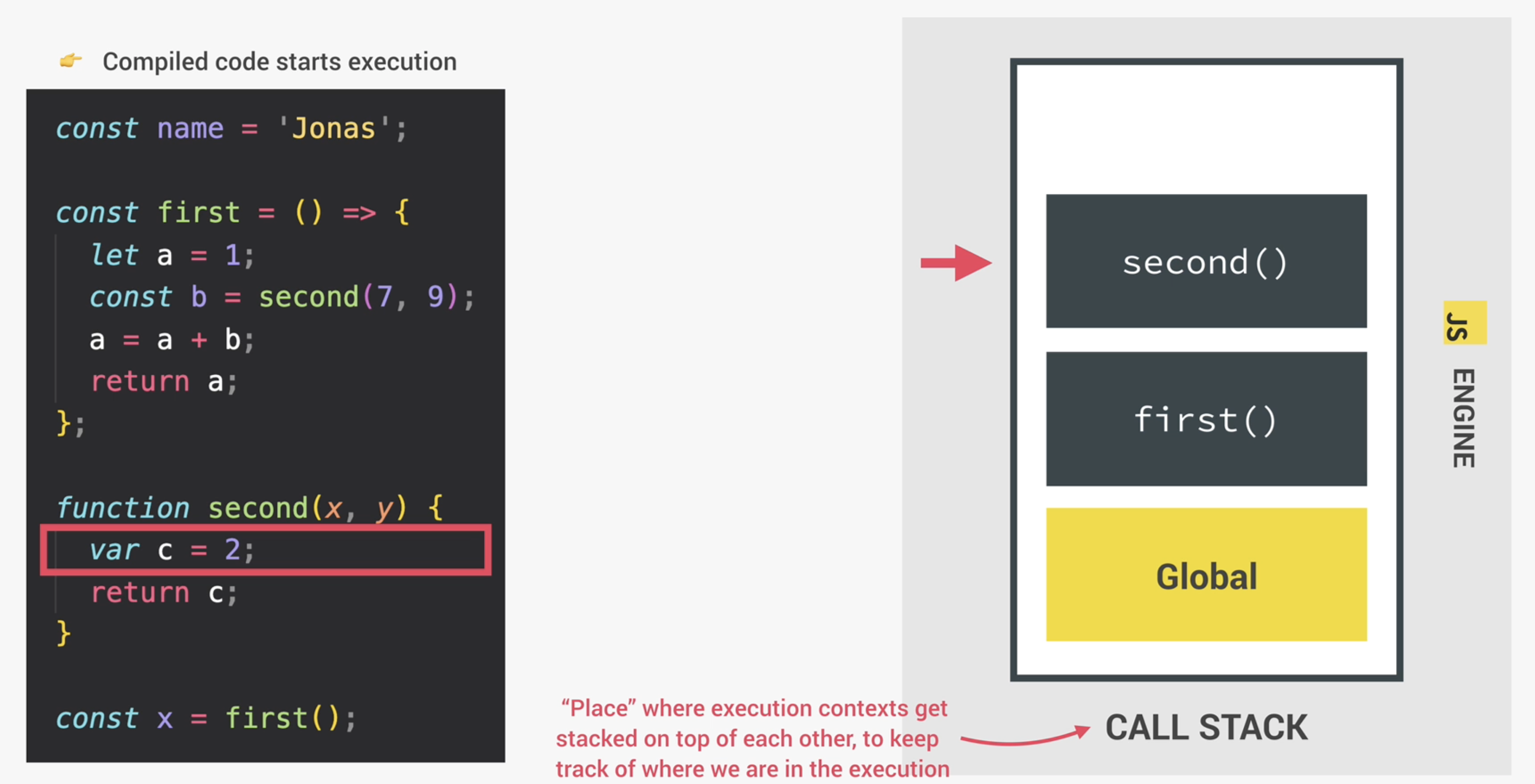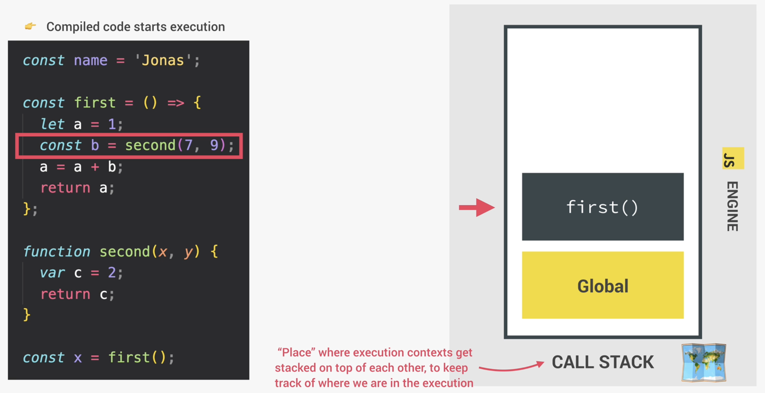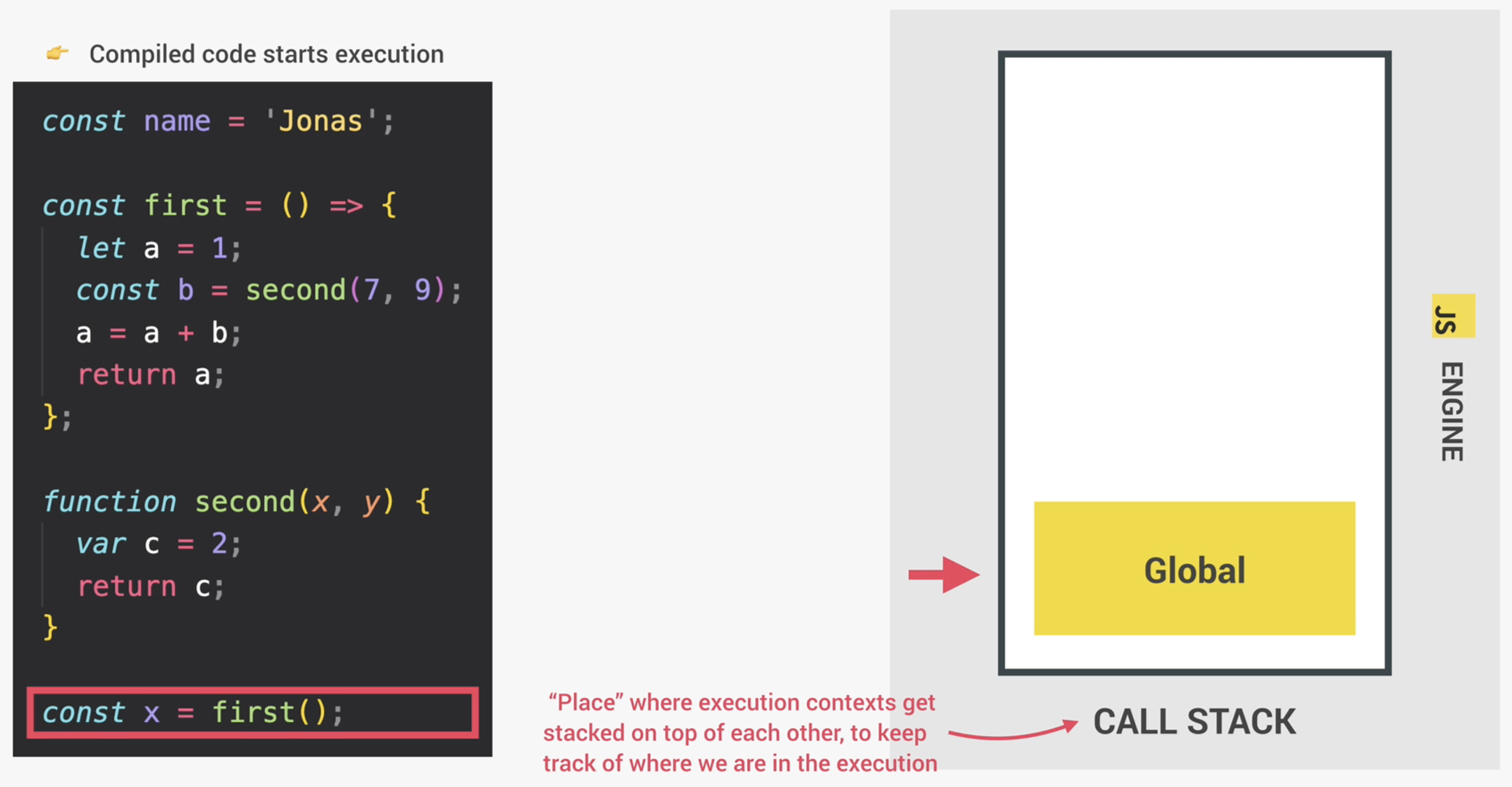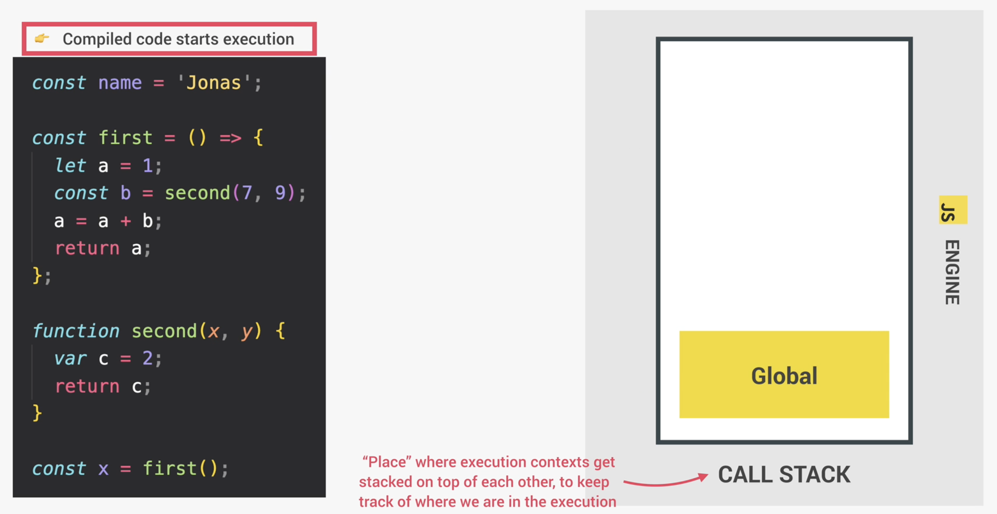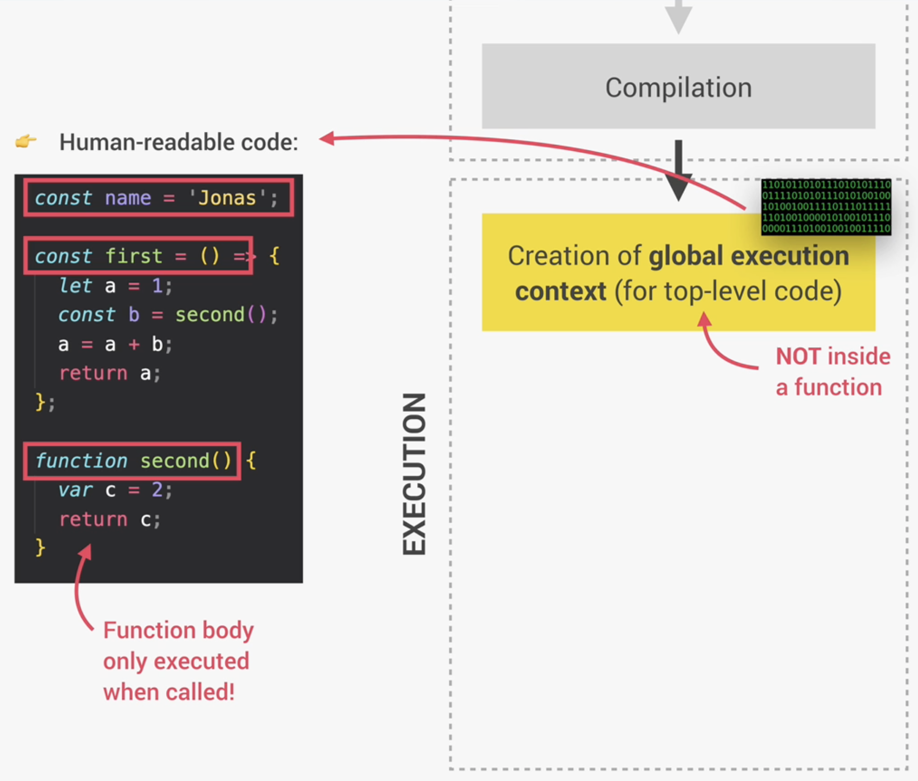 그 직후 코드는 실행(Execution)할 수 있는 준비를 마치게 되며, 상위 레벨 코드(top-level code)를 위한 Global execution context를 생성한다. 여기서 상위 레벨 코드란 어떠한 함수에도 들어가지 않는 코드를 의미한다. 다시 말해, 자바스크립트 엔진이 코드를 실행할 때 처음에는 함수 밖에 있는 코드만을 실행한다는 것이다. 아래 이미지의 코드를 살펴보자. const name = 'Jonas';라는 부분이 상위 레벨 코드이며, Global Execution Context에서 실행될 것이다. 다음 코드를 살펴보면 두개의 함수가 존재한다. 하나는 표현형(expression), 다른 하나는 선언형(declaration) 함수이다. 함수안에 있는 코드는 오직 함수가 호출되었을 때만 실행된다.