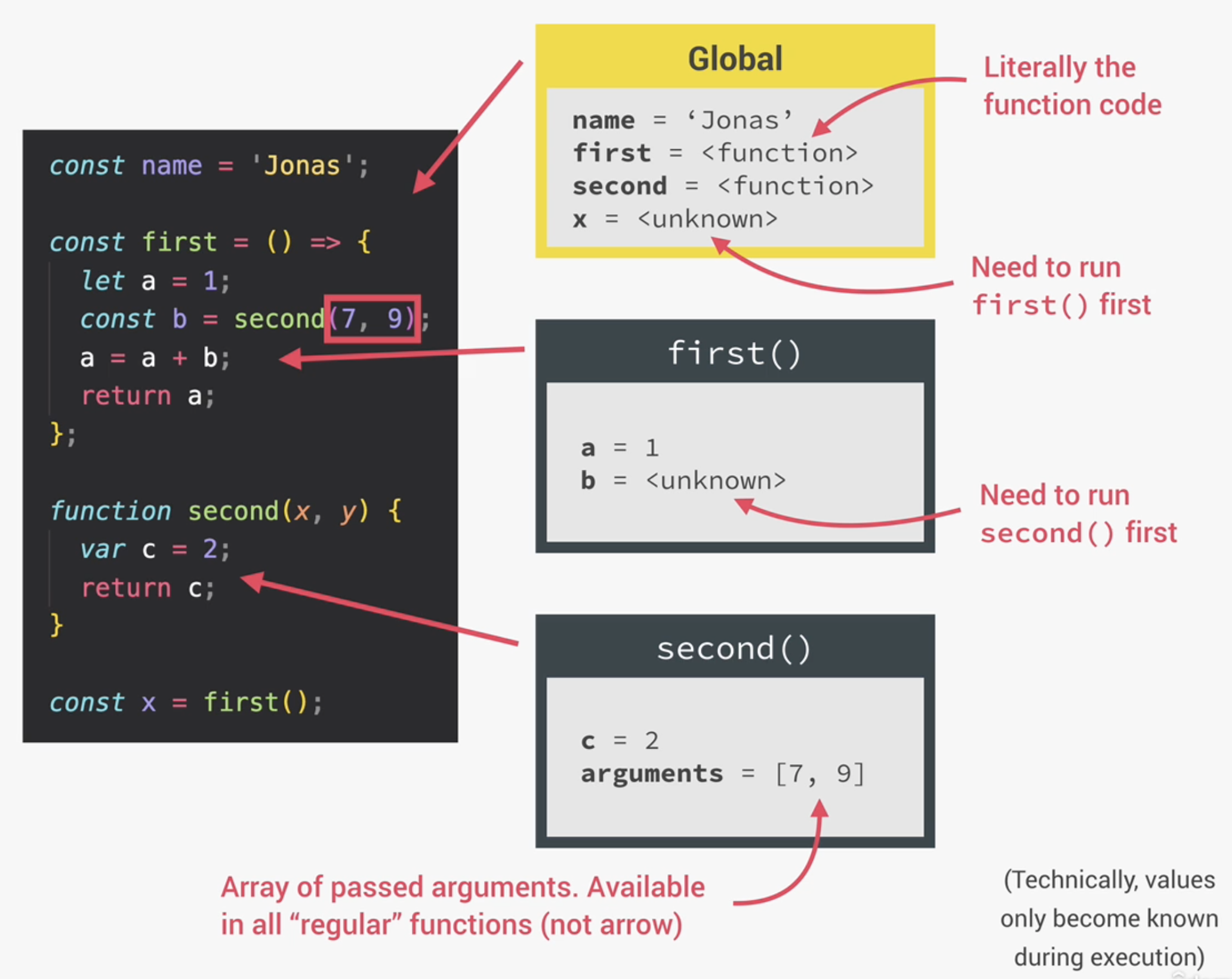 Global EC에는 const로 선언된 name 변수와 first, second 함수 선언 그리고 x 변수 선언이 있다. 함수의 경우 문자 그대로 특정 함수의 코드를 모두 포함하고 있다. x의 경우 unknown으로 표현된다. 이 값은 아직 실행하지 않은 first 함수의 결과이기 때문이다. 기술적으로 이러한 값들은 생성(평가) 단계에서는 알 수 없고 오직 실행 단계에서만 알 수 있다.