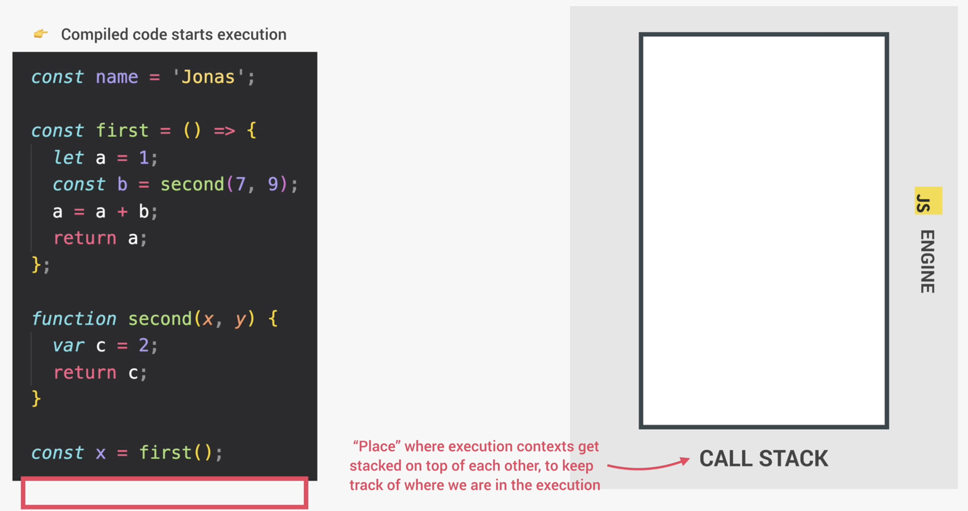상위 레벨 코드는 const name = 'Jonas'; 변수 선언 이후 first 함수 선언, second 함수 선언 순으로 실행된다. 화려하지는 않지만 일반적인 상위 레벨 코드는 이러한 방식으로 실행된다. 하지만 마지막 x 변수를 선언할 때 흥미로운 일이 발생한다. 해당 값은 first 함수를 호출 했을 때 값이 반환된다. 해당 함수를 호출하면 어떤 일이 발생할까? first 함수의 고유 실행 컨텍스트를 가져와서 함수 안의 코드를 실행할 수 있게 된다. 실행 컨텍스트는 아래의 이미지와 같이 콜 스택 최상단에 위치하며 현재 실행 중인 실행 컨텍스트가 된다.