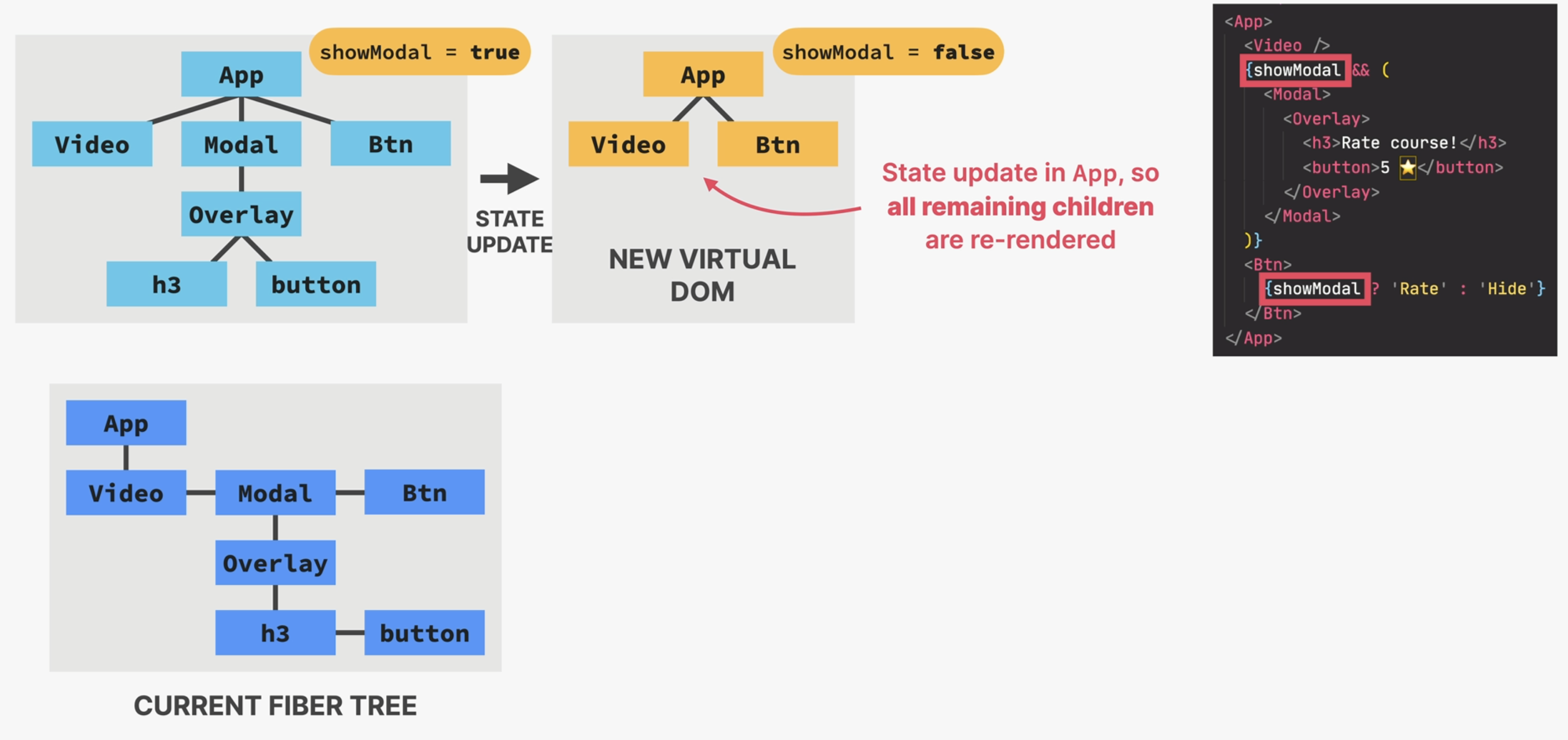 Reconcilication을 이해하기 위해 이전에 나왔던 Tree를 비교해보자. 이는 아래의 이미지에 나와있는 코드와 대응되는 것이다. App Component안에서 현재 true라고 설정되어 있는 showModal이란 state를 호출한다고 가정해보자. 이제 showModal의 state가 false로 업데이트 되었다고 해보자. 이는 Re-Render를 발생시키고 새로운 Virtual DOM을 생성시킨다. 새로 생성된 Tree에는 Modal과 모든 Children Element가 없어진다. 왜냐하면 showModal이 false이면 해당 요소들은 더이상 display될 필요가 없기 때문이다. 또한, 남아있는 모든 React Element는 Re-Render를 의미하는 노란색으로 변경된다. 상기에서 언급했듯이 Re-Render되는 Element의 모든 children Element는 Re-Render되기 때문이다.