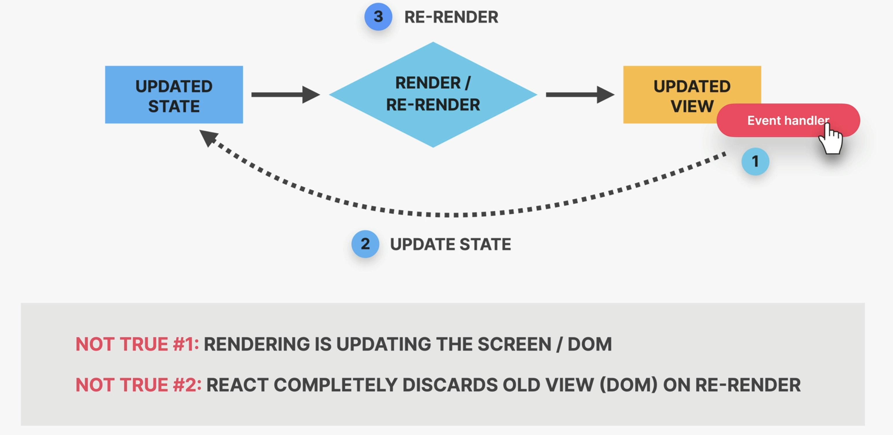 React에서 랜더링이 어떻게 동작하는지 알기 전에 먼저 State의 메카니즘에 대해서 알아보자. 일반적으로 화면(View)에서 이벤트가 발생하면 State 업데이트가 일어나고 Re-Render가 발생한다고 알고 있다. 하지만, 이는 기술적으로 바라본다면 올바르지 않다. 리엑트에서 랜더링이란 화면(View) 또는 DOM을 업데이트하는 동작이 아니기 때문이다.