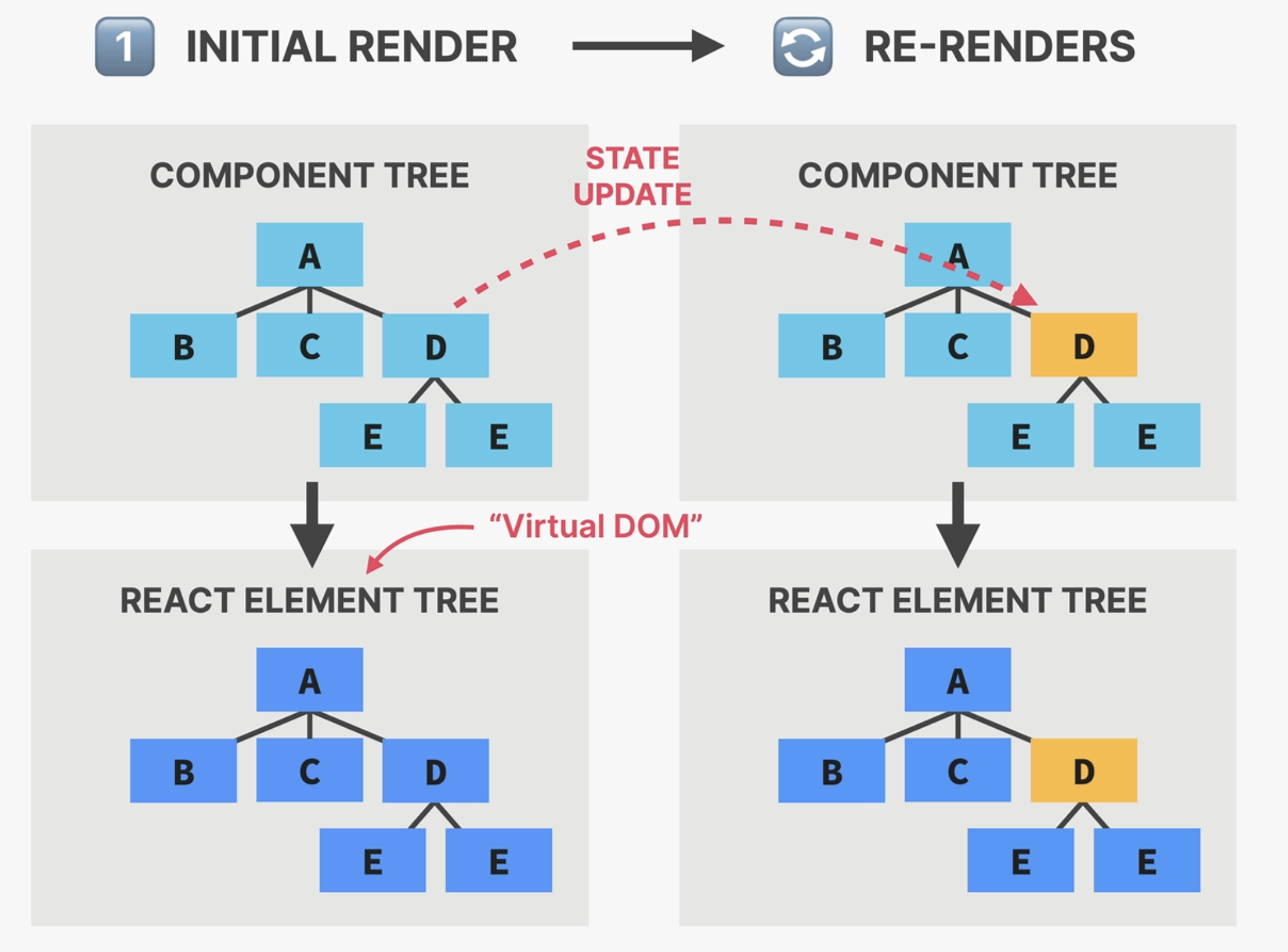 컴포넌트 D의 State가 업데이트 되었다고 가정해보자. 그럼 Re-Render가 발생한다. 이는 React가 Component D의 함수를 재호출하고 새로운 React Element를 생성하고, 새로운 React Element Tree로 변경한다는 의미이다. 즉, 새로운 Virtual DOM이 생성되는 것이다.