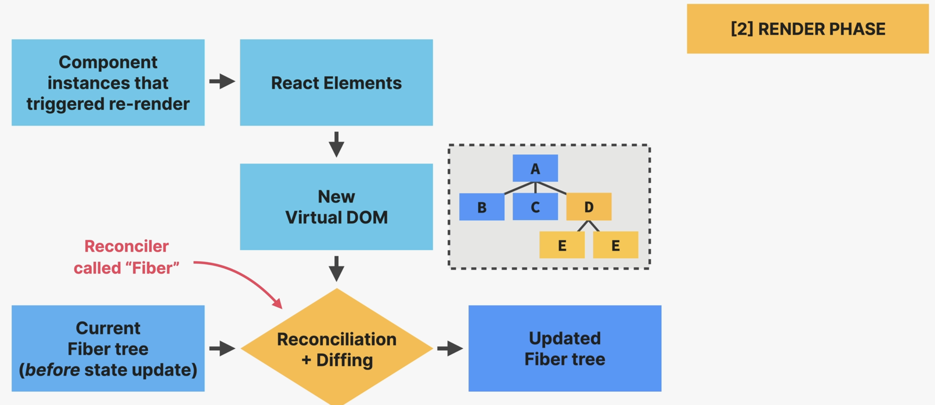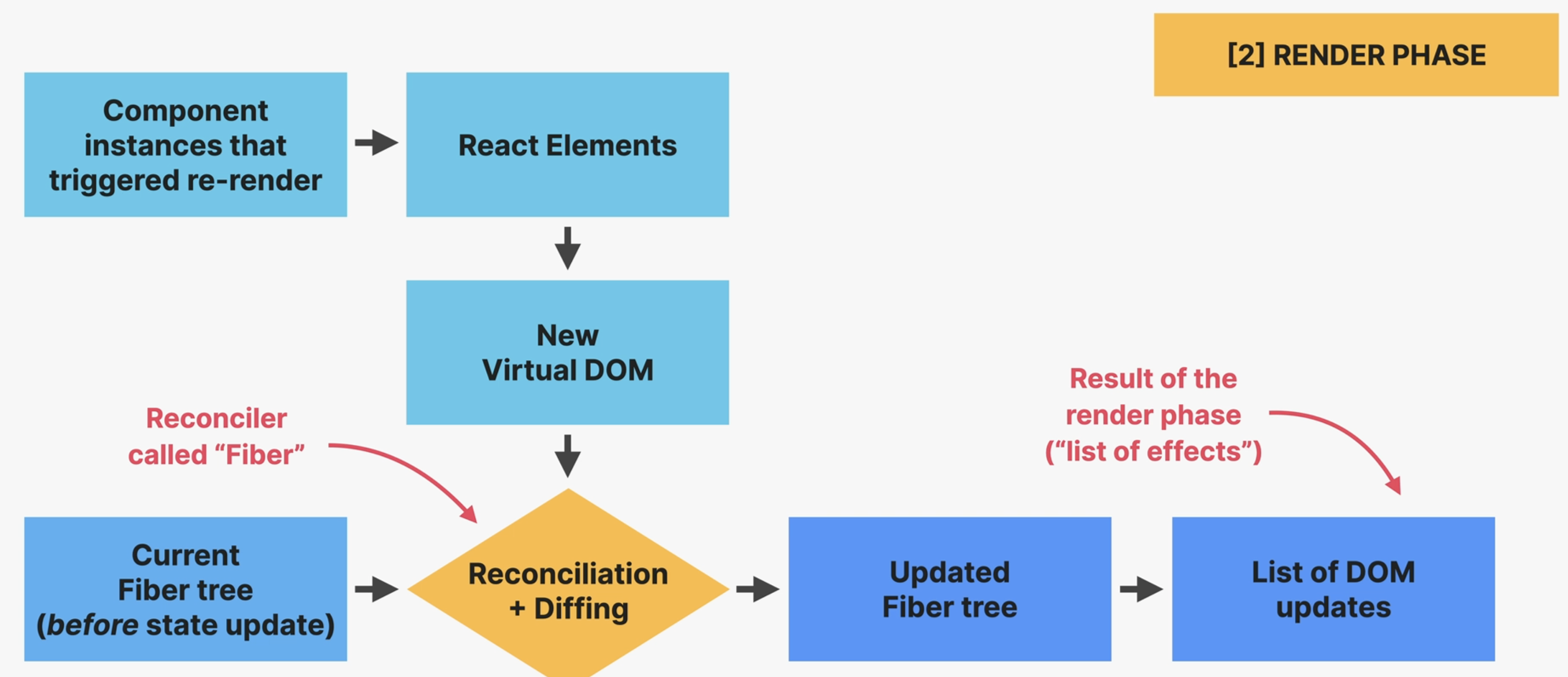 새로운 Virtual DOM은 State 업데이트 전에 현재의 Fiber Tree와 조화(reconciled)시키도록 한다. Reconciliation은 React의 Fiber라 불리는 Reconciler에 의해 동작하고, Fiber Tree를 생성한다. Reconciliation 프로세스의 결과로 Fiber Tree가 업데이트 된다. 해당 Fiber Tree는 DOM을 작성(Write)하는데 사용된다.