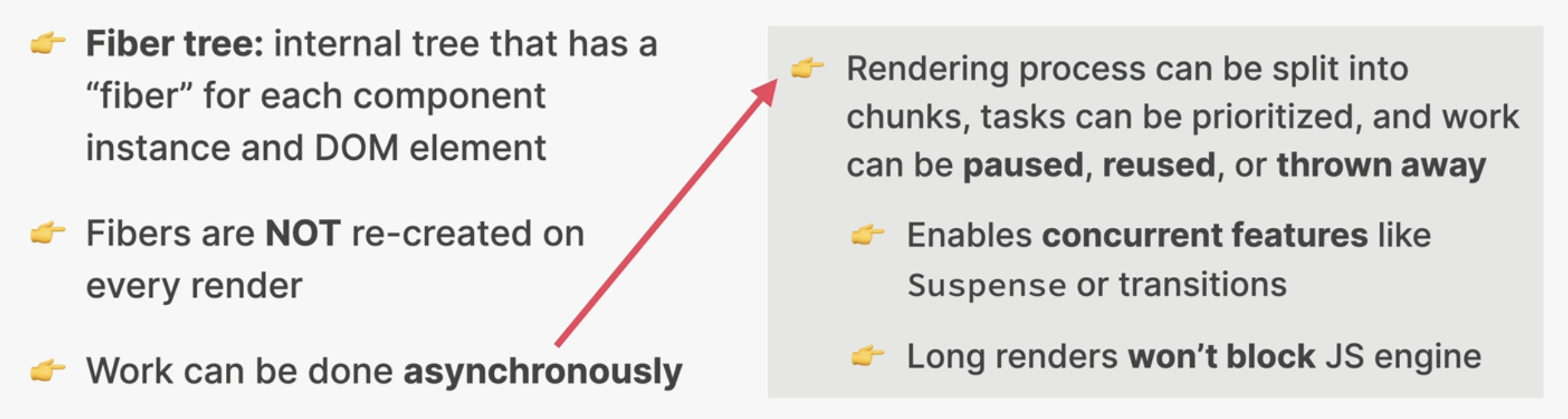 다시, Fiber의 units of work 개념으로 돌아오자. 가장 중요한 것은 Fiber reconciler는 비동기적으로 동작한다는 것이다. 디사 말해, 이는 Reconciler가 수행하는 Rendering 프로세스 작업이 여러 덩어리로 나뉠 수 있다는 것이다. 작업은 우선순위가 정해질 수 있으며 재사용, 버리기, 멈춤 등을 수행할 수 있다는 의미이다. 이 모든 것이 개발자에게는 보이지 않지만 React의 뒤에서 일어난다는 사실을 기억해야한다. 비동기적 동작은 React 18부터 Suspense 또는 Transitions이라는 특징으로 나타나게 된다. 랜더링 과정을 정지했다가 재개할 수있어 랜더링이 길어질 경우 JavaScript 엔진을 막는 일도 생겨나지 않는다. 이는 Render 단계에서 아직 DOM에 가시적인 출력이 발생하지 않기 때문에 가능한 것이다.