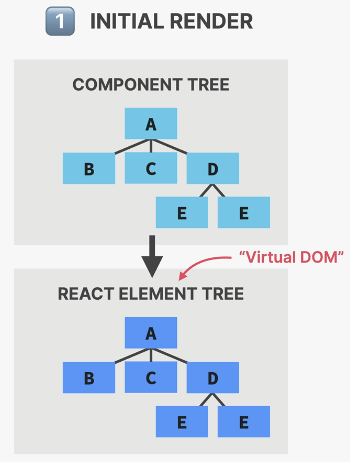 처음 Render가 발생할 때, React는 전체 Component Tree를 받고(Take) 이를 하나의 큰 React Element Tree로 만든다. 이 React Element Tree를 Virtual DOM이라고 부른다. Virtual DOM이란 Component Tree안에 모든 인스턴스로부터 만들어진 React Elements의 Tree이다. Virtual DOM은 자바스크립트 객체로 반복적인 작업이 많더라도 상대적으로 가볍고(Cheap) 빠르게 multiple tree를 구성한다. 많은 사람들이 React를 설명할 때 Virtual DOM을 가장 많은 예시를 든다. Virtual DOM이 단순히 자바스크립트 객체라면 그렇게 어려운 개념이 아니다. React 공식 문서에도 Virtual DOM란 단어는 이제는 사용하지 않는다. 하지만, 많은 사람들이 사용하고 있는 개념이고 React Element Tree라는 단어보다 더 세련되어 보인다. 또한, 어떠한 사람들은 Shadow DOM이라는 단어와 혼동하기도 한다. Shadow DOM은 Virtual DOM과 아무런 관련이 없다. Shadow DOM은 브라우저 기술로 웹 컴포넌트에 사용된다.