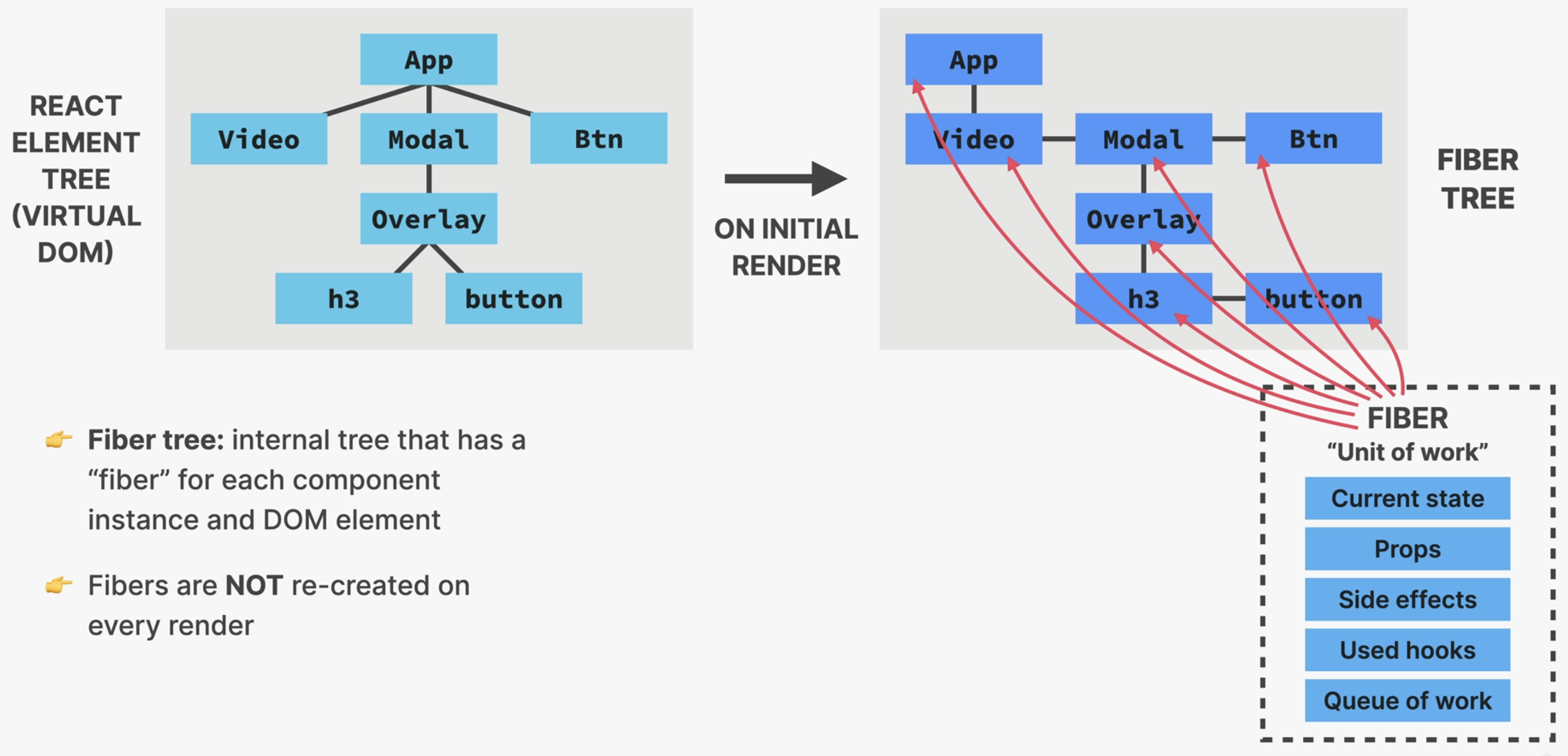 응용 프로그램의 초기 렌더링 동안 Fiber는 전체 React Element Tree(Virtual DOM)를 가져온다(take). 이 Virtual DOM을 기반으로 Fiber Tree라는 또 다른 Tree를 만든다. Fiber Tree는 특별한 내부 트리로 어플리케이션에서 fiber가 가지고 있는 각 Component 인스턴스와 DOM Element의 Tree이다. Fiber는 Virtual DOM의 React Element와는 달리 Fiber는 모든 Render에 대해서 re-created를 발생시키지 않는다. Fiber Tree는 파괴되지 않는다(never destoryed). 그 대신 변경 가능한 데이터 구조이며, 일단 초기 렌더링 단계에서 생성되면 미래에 있을 Redonciliation 단계에서 간단하게 지속적으로 변형한다. 이런 특징들이 Fiber를 현재 Component의 State, Props, Side effects, 사용된 hook 등을 지속적으로 추적하기에 완벽한 장소로 만든다. 실제, Screen에서 보는 컴포넌트 인스턴스의 State와 Props는 Fiber Tree에 대응되는 Fiber 내부에 저장된다.