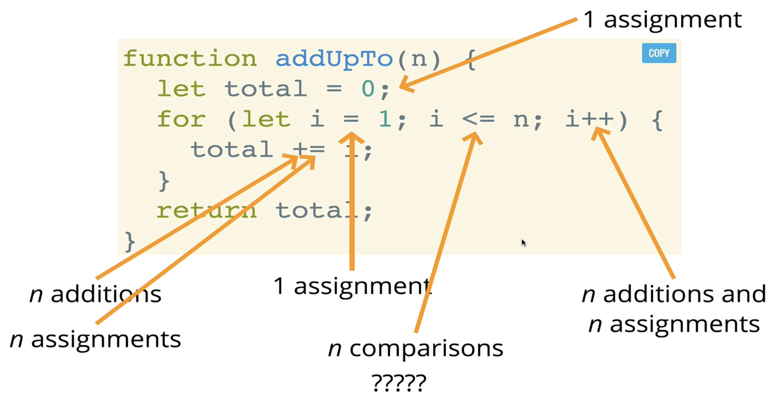 코드가 실행될 때 걸리는 정확한 시간을 초로 측정하는 것보다는 컴퓨터가 처리하는 연산 갯수를 세면된다. 단순하게 만들어서 이 알고리즘은 실핼될때 연산은 5번해야하고 어떤 알고리즘은 7번해야 한다면, 컴퓨터의 사양과는 상관없이 시간은 항상 연산의 갯수에 달려 있을 것이다. 연산이 빠른편이었던 두번째 코드의 연산 갯수를 살펴보자.