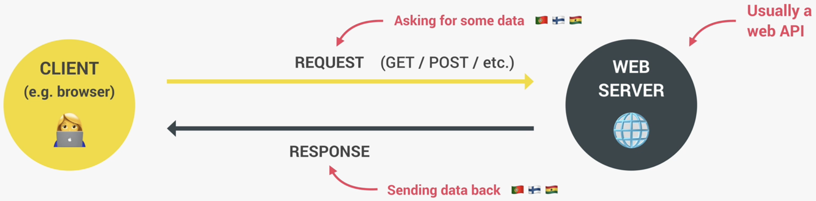 클라이언트와 서버간의 상호작용은 Background에서 비동기(asynchronous)로 일어난다. GET, POST 등과 같은 다양한 유형의 요청이 있을 수 있다. 서버에 데이터 요청을 했을 때 일반적으로 서버는 Web API를 가지고 있다. 우리가 요청하는 데이터는 이 API에 들어가 있다. 그렇다면 API란 무엇인가?