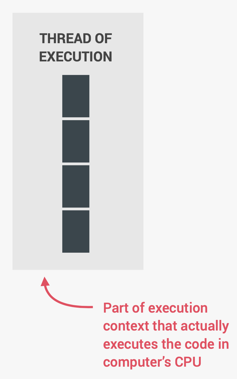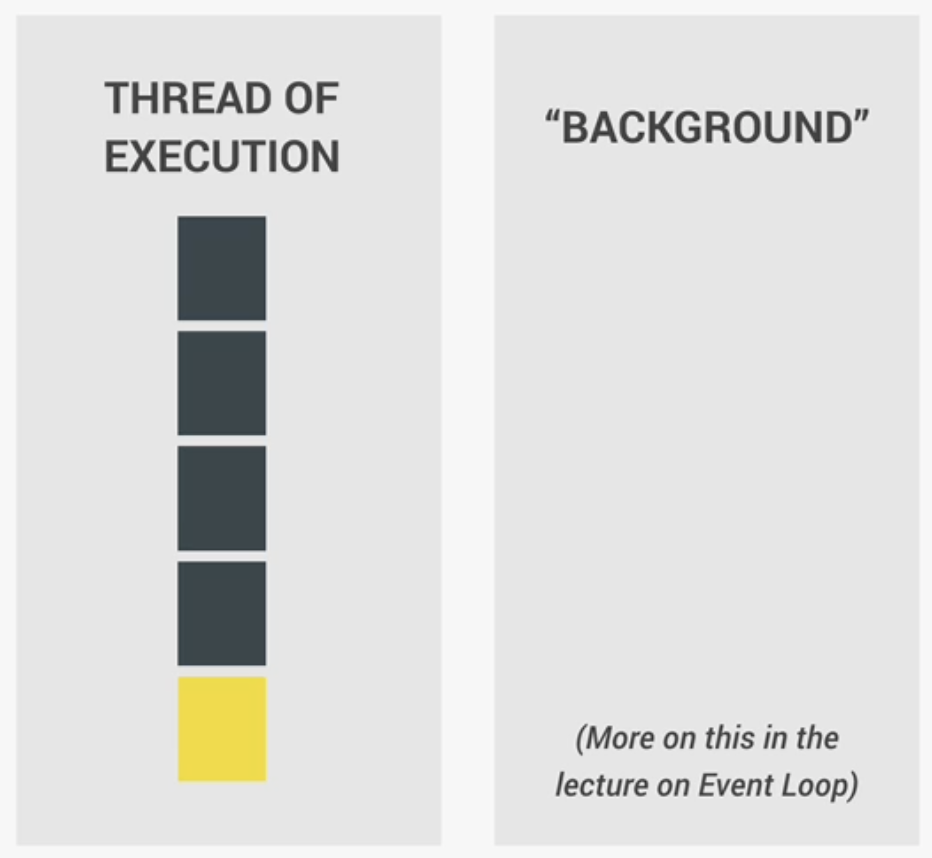 코드가 '1번'라인에 도달하면 '실행 스레드(Thread of execution)'가 동작하며 코드가 실행된다. '실행 스레드'는 실행 컨텍스트의 일부로 컴퓨터 CPU에서 코드를 실질적으로 실행한다. 이 '실행 스레드'에서 '2번', '3번', '4번' 라인이 연속적으로 실행된다. 이때 각각의 코드 라인은 이전 라인의 실행이 끝날때까지 기다린다. (Each line of code waits for previous line to finish) 따라서 코드 한 줄이 실행되는데 작업이 오래 걸리면 문제가 발생할 수 있다. 예를들어, '3번' 라인처럼 alert 경고문이 있다고 가정하자. alert는 '확인' 버튼을 누르기 전까지는 코드의 실행을 차단한다. 즉, 오래 걸리는 동작(Long-running operations)이 코드의 실행을 멈춘(block)다는 사실을 알고 있어야 한다.