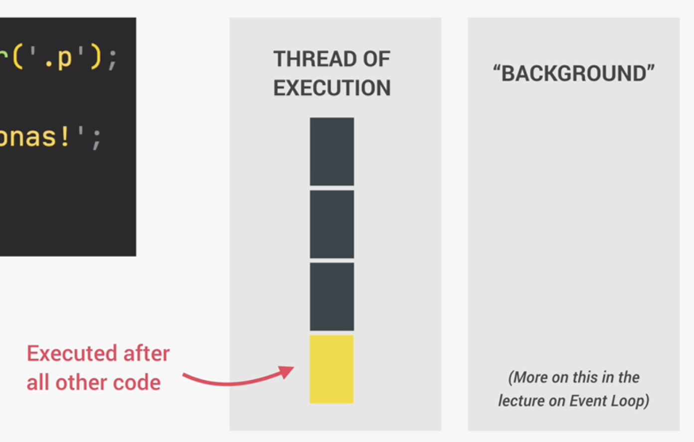상기 코드를 분석해보자. 첫 줄은 여전히 동기 코드로 동작한다. 두번째 코드 동기화 방식으로 동작한다. 하지만, setTimeout 함수는 비동기 방식으로 타이머를 시작한다. 이는 메인 코드가 실행되는 것을 막지 않고, 백그라운드(Background)에서 타이머(Timer)가 실행된다는 것을 의미한다. 이때 setTimeout의 콜백 함수는 바로 실행되지 않고 타이머(Timer)가 Background에서 완료되면 실행된다. 이 경우 콜백 함수는 비동기(asynchronous) 코드이다. 왜냐하면 비동기 코드란 "background" 작업이 완료되었을 때 실행되는 코드이기 때문이다.