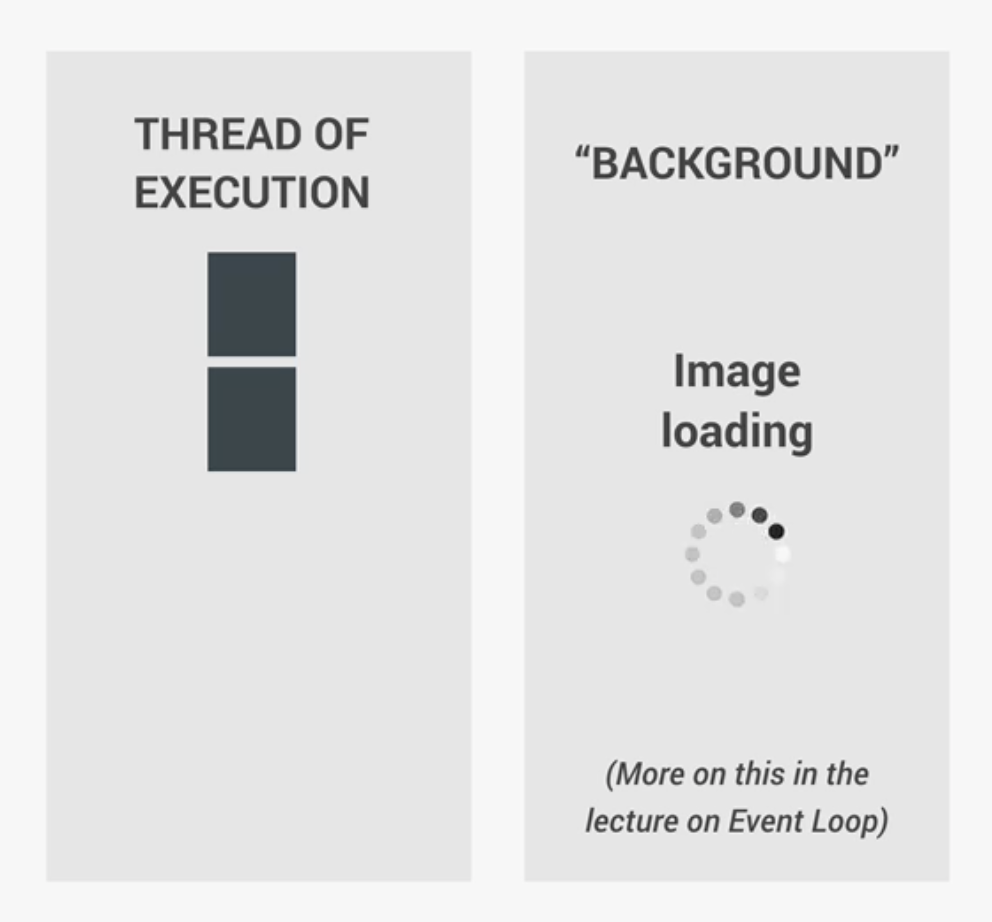 여기서 중요한 사실은 이벤트 리스너(Event Listener)만으로는 코드를 비동기로 만들지 않는다는 것이다. 예를 들어, 버튼을 클릭하는 이벤트 리스너는 Background에서 아무 일도 하지 않는다. 클릭이 일어나길 기다리지만 아무것도 하지 않으며 어떠한 비동기적인 행동은 존재하지 않는다. 상기의 코드 예제를 비동기로 만드는 것은 이미지가 Background에서 비동기로 로딩된다는 것이다. Timer 또는 이미지 로딩과 같은 비동기 작업(Task)이 존재하지 않으면 이벤트 리스너만으로는 비동기 코드가 아니다. 자바스크립트에서 이미지 로딩, 타이머 이외의 비동기 작업은 'Geolocation API'와 'AJAX calls'이 있다.