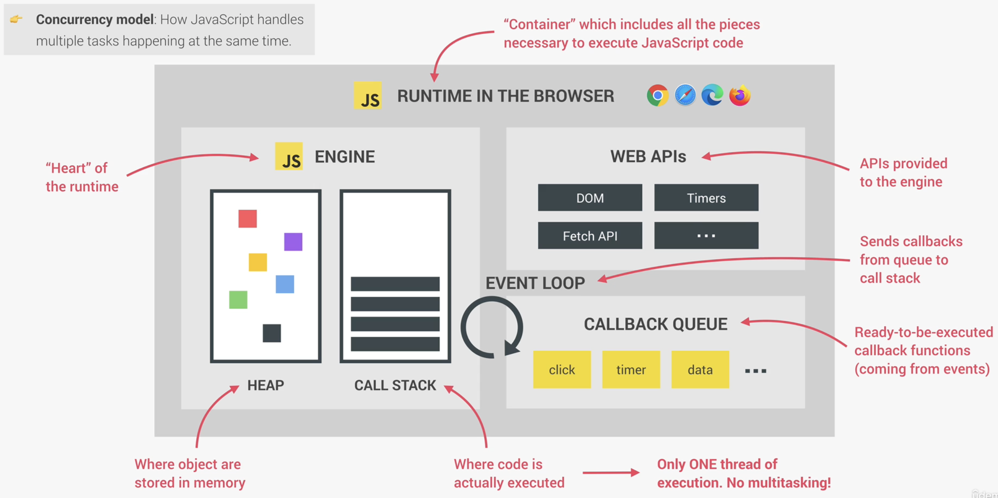 Javascript 런타임은 기본적으로 컨테이너이다. 이 컨테이너에는 자바스크립트 코드를 실행하는 데 필요한 모든 요소(pieces)가 포함되어 있다. 각 요소에 대해서 알아보자.