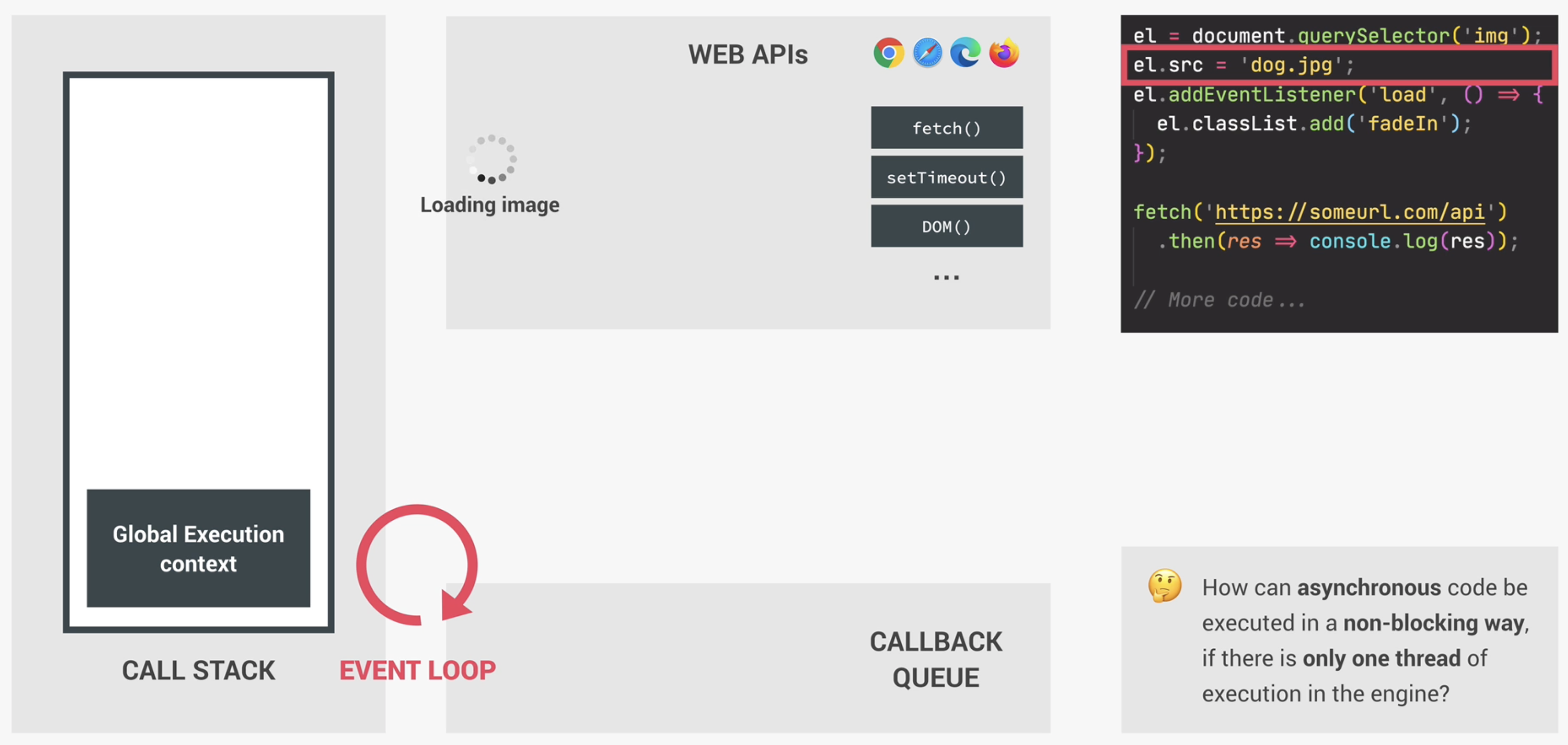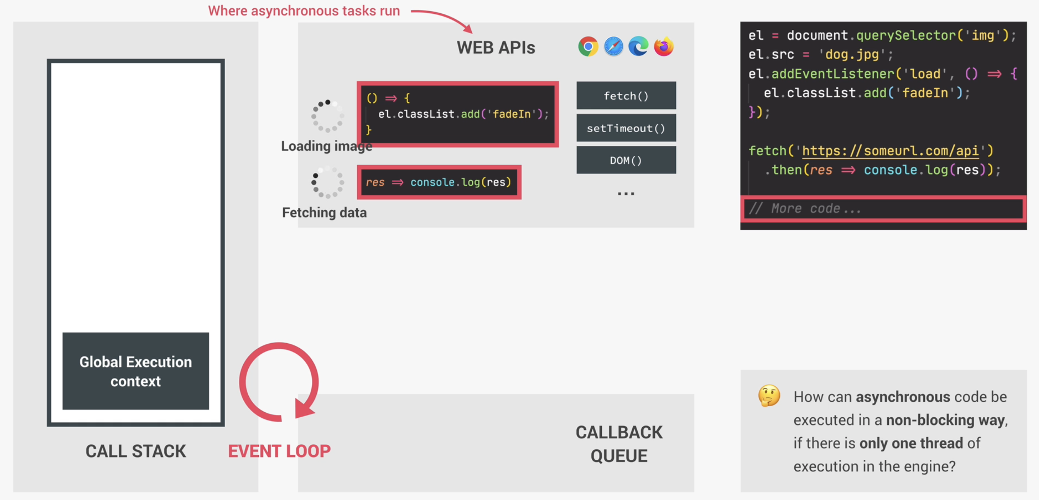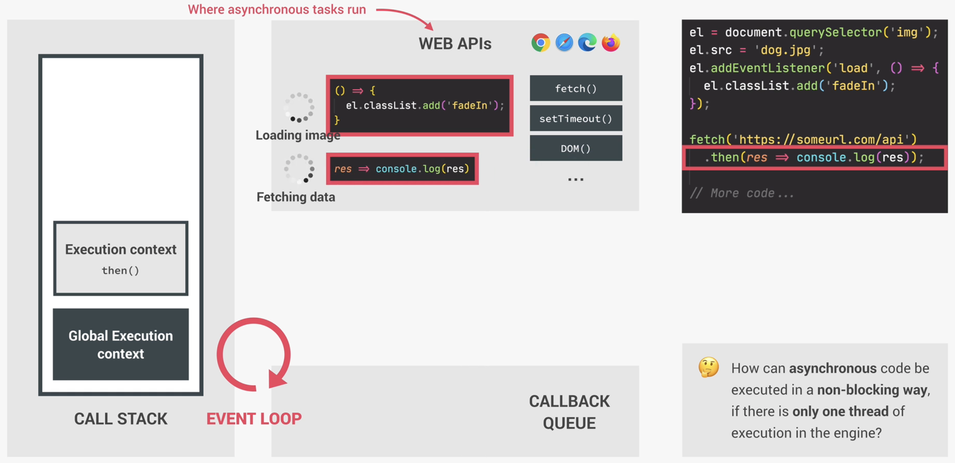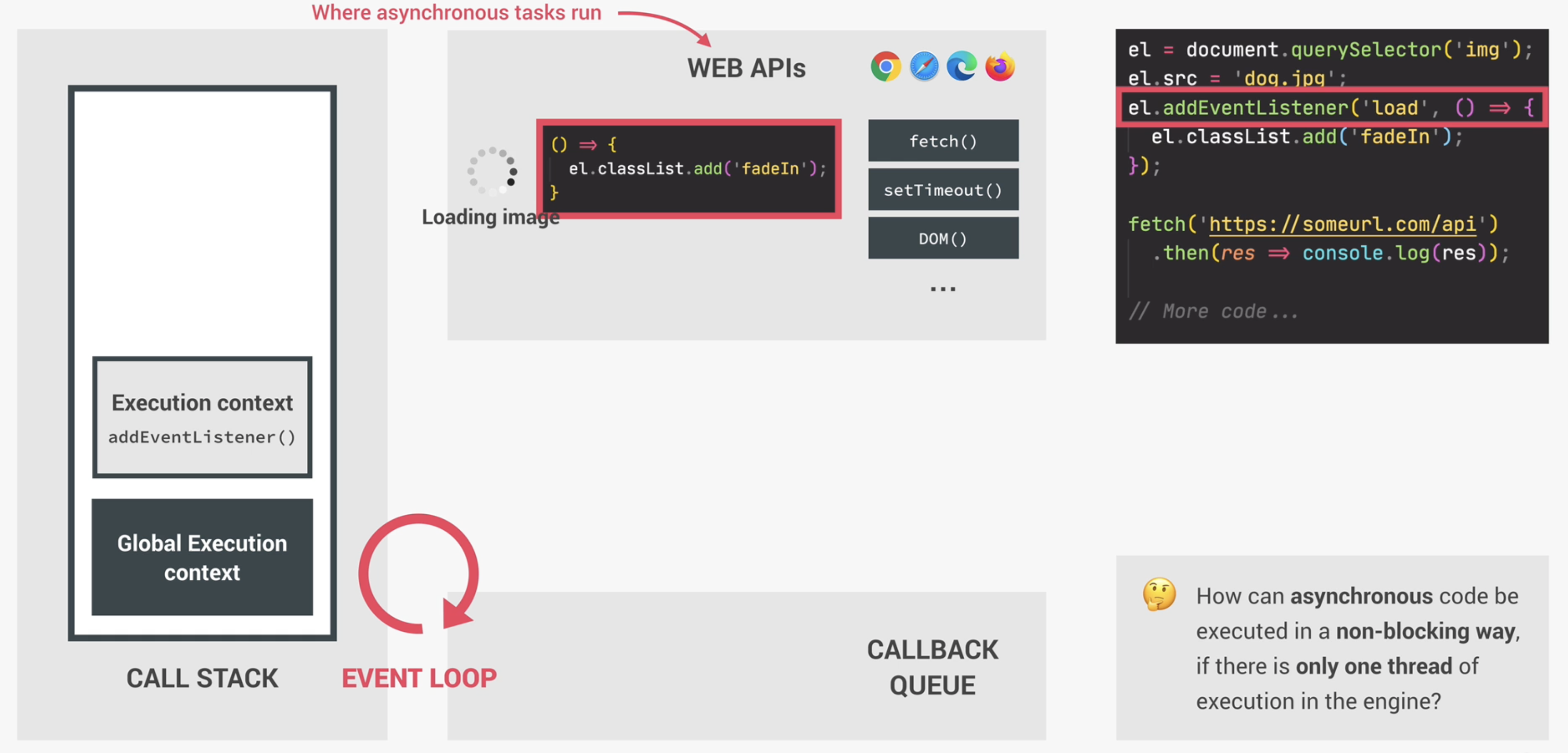'이미지에 속성을 설정'하는 두번째 줄 코드를 실행하면 이미지를 비동기적으로 로드하기 시작한다. 아래의 그림의 'WEB APIs'에서 이미지가 로딩되는 것을 확인할 수 있다. (첫번째 줄의 코드는 Callstack에서 사라진 뒤이다) DOM과 관련된 모든 건 Javascript가 아니라 Web API의 일부이다. 다시 말해, Web API 환경에서 DOM과 관련된 비동기 작업이 실행되는 것이다. Timer와 AJAX 그리고 다른 모든 비동기 작업도 마찬가지이다. 즉, 이미지 로딩은 Call Stack에서 같은 메인 스레드 실행이 아니라 Web API 환경에서 실행된다. (만약, 이미지 로딩이 Call Stack에서 실행된다면 이미지가 로딩될 때까지 자바스크립트 코드는 멈춰있어야 한다.) 이미지 로딩이 끝난 뒤에 무언가를 하고 싶다면 'load' 이벤트 리스너를 활용해야한다.