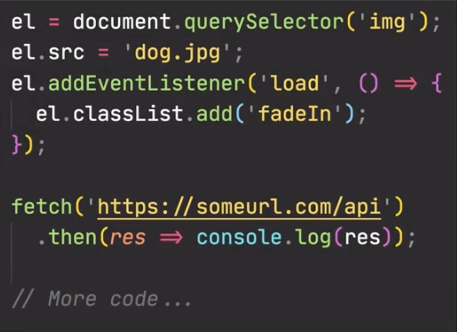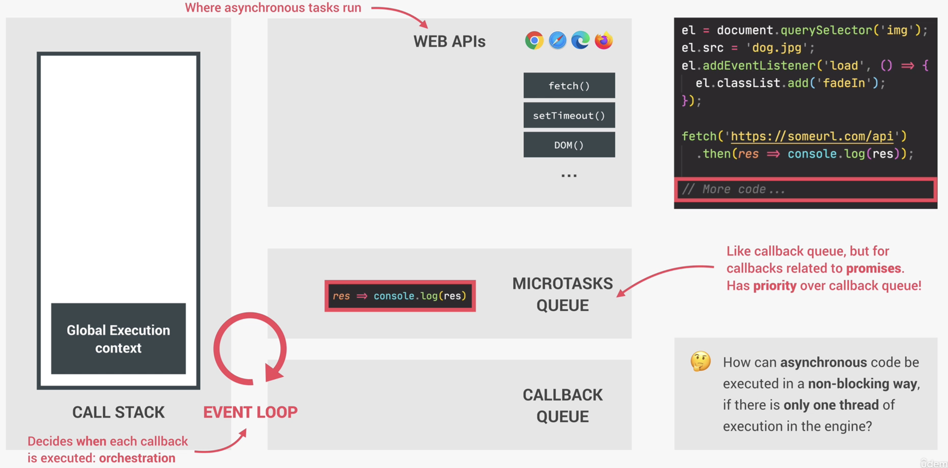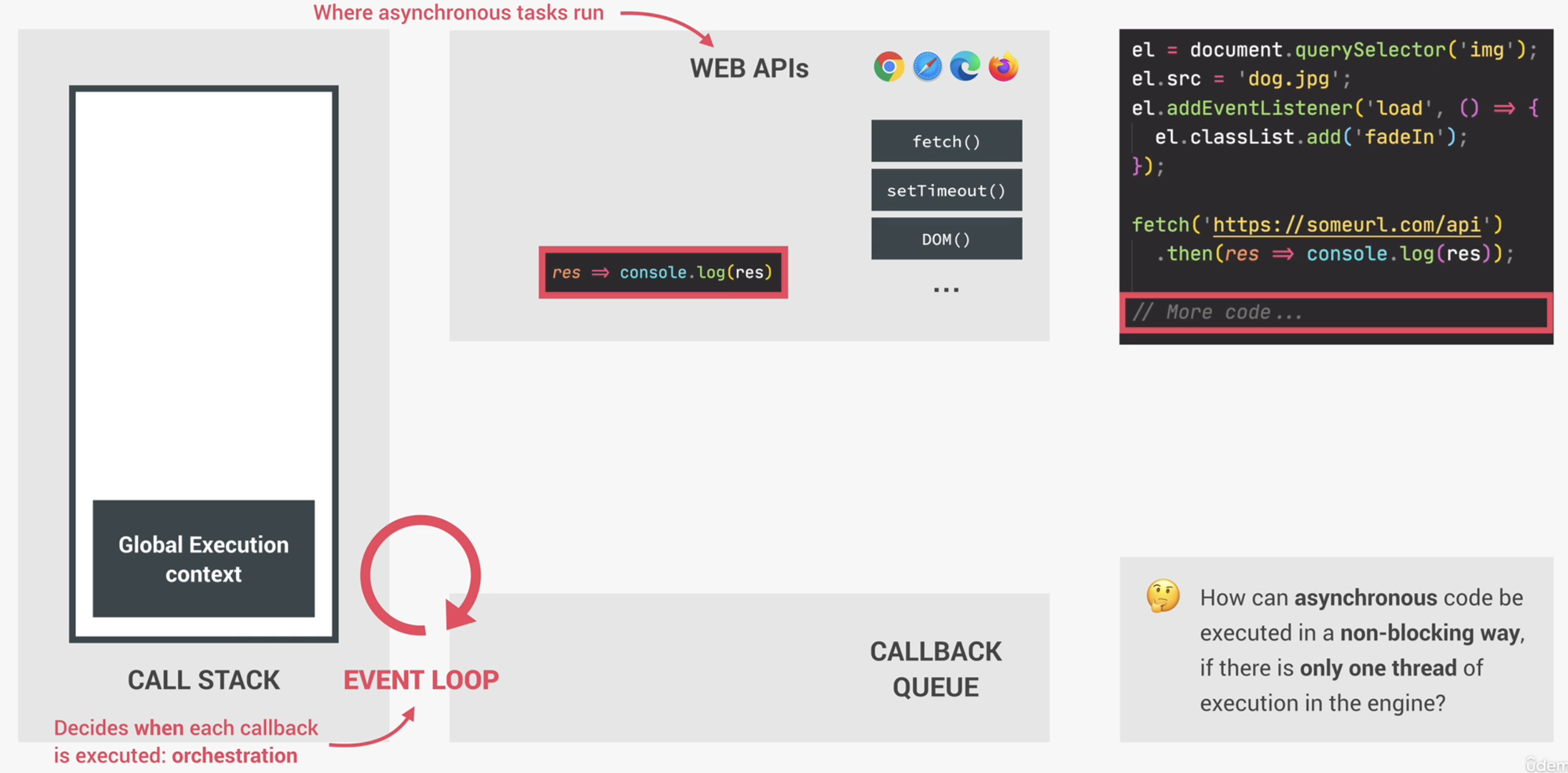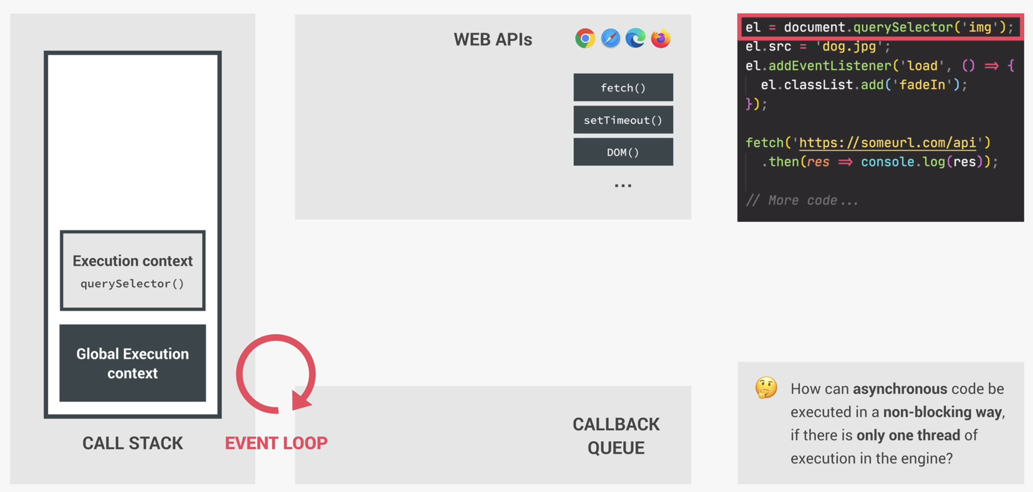 '이미지에 속성을 설정'하는 두번째 줄 코드를 실행하면 이미지를 비동기적으로 로드하기 시작한다. 아래의 그림의 'WEB APIs'에서 이미지가 로딩되는 것을 확인할 수 있다. (첫번째 줄의 코드는 Callstack에서 사라진 뒤이다) DOM과 관련된 모든 건 Javascript가 아니라 Web API의 일부이다. 다시 말해, Web API 환경에서 DOM과 관련된 비동기 작업이 실행되는 것이다. Timer와 AJAX 그리고 다른 모든 비동기 작업도 마찬가지이다. 즉, 이미지 로딩은 Call Stack에서 같은 메인 스레드 실행이 아니라 Web API 환경에서 실행된다. (만약, 이미지 로딩이 Call Stack에서 실행된다면 이미지가 로딩될 때까지 자바스크립트 코드는 멈춰있어야 한다.) 이미지 로딩이 끝난 뒤에 무언가를 하고 싶다면 'load' 이벤트 리스너를 활용해야한다.